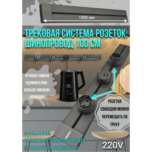 Шинопровод 100 см – трек может быть как встраиваемый (в нишу стены), так и накладной, его можно использовать на кухне, в спальне, в офисе, гостиной, на рабочем столе, в ванной комнате, прихожей – это отличная альтернатива стационарным розеткам, удлинителям и переходникам. В него можно подключать несколько приборов одновременно. С помощью трековой системы розеток – вы навсегда избавитесь от свисающих шнуров, кабелей и тройников. Трековая система розеток позволяет легко добавлять, убирать и перемещать розетки по шине в удобное для вас место. Благодаря поворотному движению встраиваемая розетка может быть установлена в идеальном положении для вашей кухни, офиса или переговорной комнаты. Шину можно устанавливать горизонтально и вертикально. Трек – выполнен из алюминиевого сплава, это металлический профиль с проходящими вдоль него токопроводящими медными шинами. Наша трековая система розеток – это отличная замена обычным розеткам и удлинителям, по треку можно свободно перемещать розетки выбирая более удобное размещение, также можно добавлять на шину дополнительные розетки – Евро розетки или USB + TYPE-C. Высокая мощность 8000W, позволяет подключить несколько электроприборов. Уплотнительная резиновая лента защищает трек попадания от пыли. Розетки и шинопровод заземлены, поэтому поражения током не произойдет. Внимание! шинопровод продаёться без розеток - розетки приобретаются отдельно!