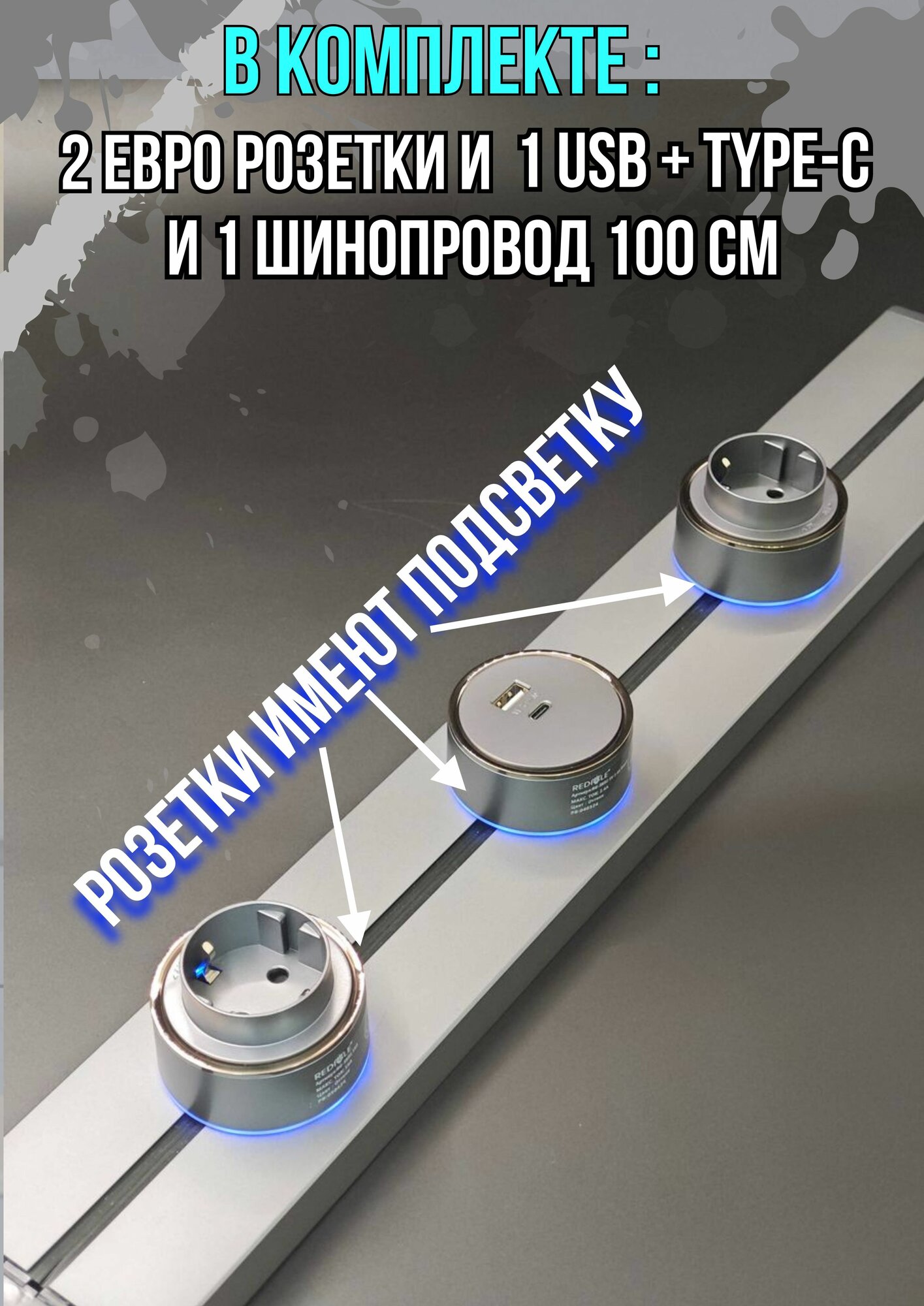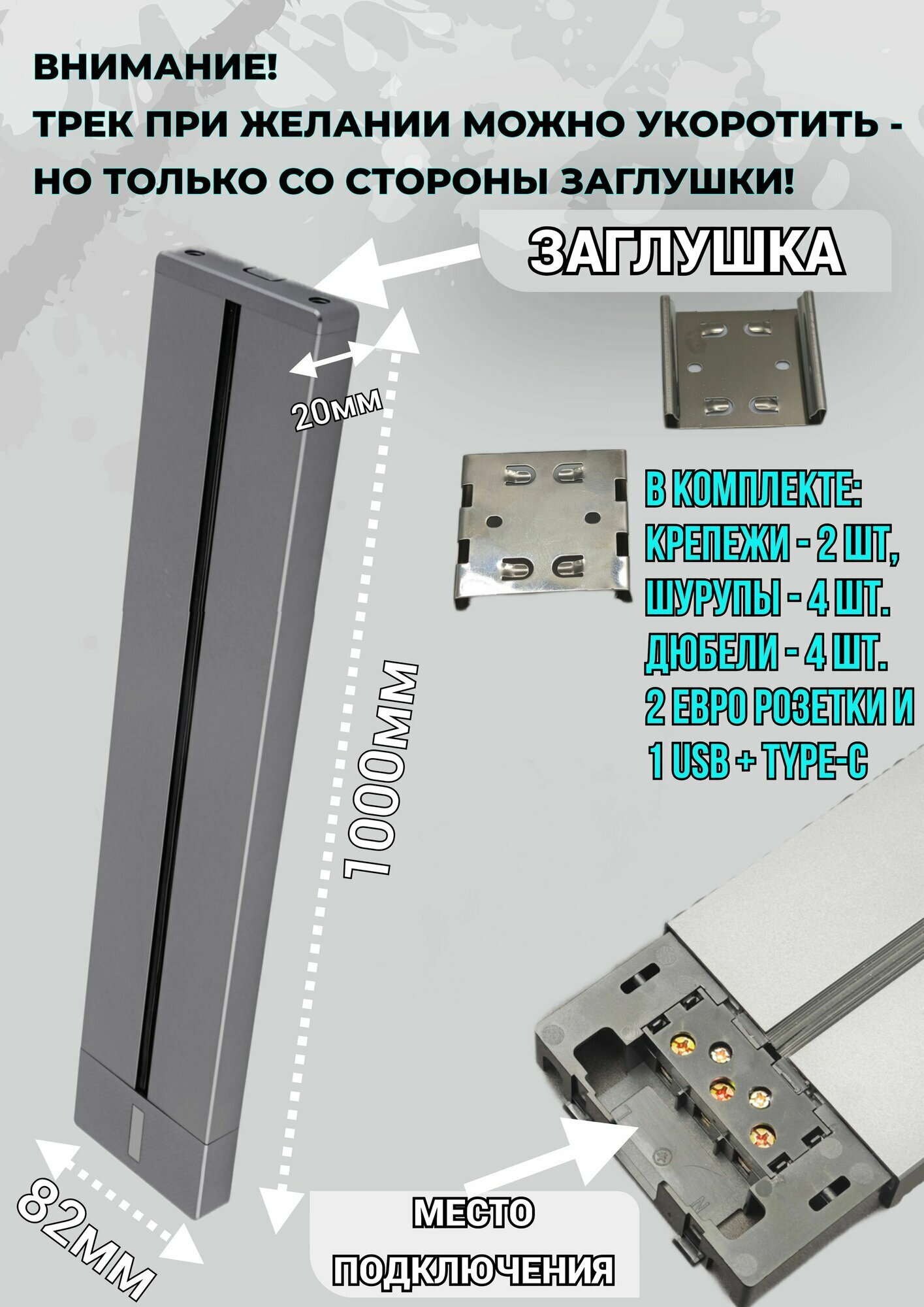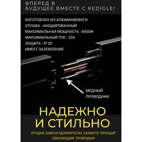 Трековая система розеток комплект: Шинопровод 100 см + 2 евро розетки и 1 USB+TYPE-C Трек может быть как встраиваемый (в нишу стены), так и накладной, его можно использовать на кухне, в спальне, в офисе, гостиной, на рабочем столе, в ванной комнате, прихожей – это отличная альтернатива стационарным розеткам, удлинителям и переходникам. В него можно подключать несколько приборов одновременно. С помощью трековой системы розеток – вы навсегда избавитесь от свисающих шнуров, кабелей и тройников. Трековая система розеток позволяет легко добавлять, убирать и перемещать розетки по шине в удобное для вас место. Благодаря поворотному движению встраиваемая розетка может быть установлена в идеальном положении для вашей кухни, офиса или переговорной комнаты. Шину можно устанавливать горизонтально и вертикально. Трек – выполнен из алюминиевого сплава, это металлический профиль с проходящими вдоль него токопроводящими медными шинами. Наша трековая система розеток – это отличная замена обычным розеткам и удлинителям, по треку можно свободно перемещать розетки выбирая более удобное размещение, также можно добавлять на шину дополнительные розетки – Евро розетки или USB + TYPE-C. Высокая мощность 8000W, позволяет подключить несколько электроприборов. Уплотнительная резиновая лента защищает трек попадания от пыли. Розетки и шинопровод заземлены, поэтому поражения током не произойдет. Характеристики розеток: Евро розетка: - имеет подсветку сине-голубую - максимальная нагрузка – 16А USB + TYPE-C розетка: - имеет подсветку сине-голубую - максимальная нагрузка – 2,4А Комплектация: Шинопровод – 100 см, 2 крепежа, 4 шурупа, 4 дюбеля 2 евро розетки и 1 USB+TYPE-C