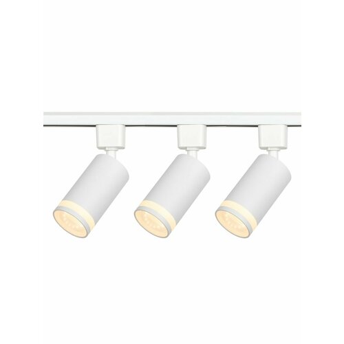 В комплект входит 3 однофазных акцентных трековых светильника TR77 под лампу GU10 с акриловым кольцом, 1 метр шинопровода и 3 лампы GU10.