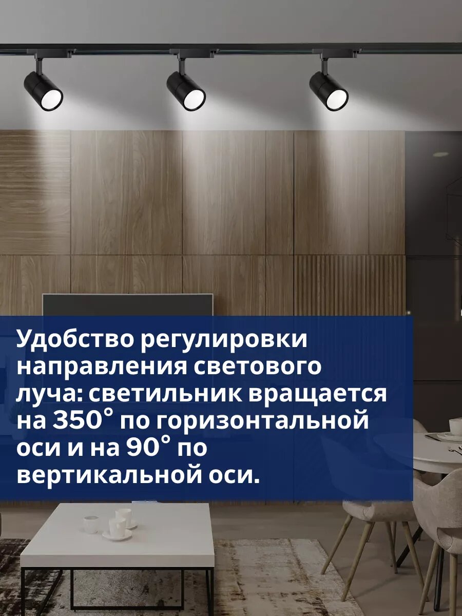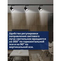 светильник вращается на 350° по горизонтальной оси и на 90° по вертикальной оси, угол освещения 80 градусов, однофазная система система подключения