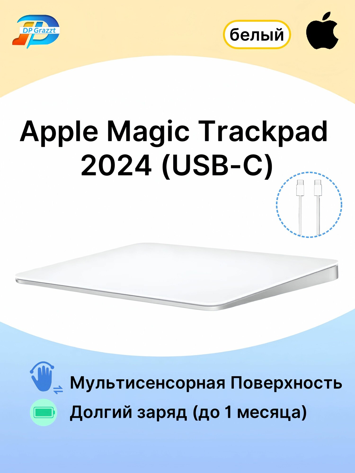 Apple Magic Trackpad (USB C), Мультисенсорная поверхностьОбзор: Трекпад Magic Trackpad имеет беспроводную и перезаряжаемую конструкцию и поддерживает все мультисенсорные жесты и технологию Force Touch. Датчики, расположенные под поверхностью сенсорной панели, могут ощущать тонкие различия в прилагаемом усилии, что позволяет получить больше функций под рукой и более глубоко взаимодействовать с контентом. Он имеет большую стеклянную поверхность без рамок, что делает его более удобным и эффективным, чем когда-либо, при прокрутке или смахивании вашего любимого контента. Этот трекпад Magic Trackpad будет автоматически сопряжен с вашим Mac, что позволит вам немедленно начать работу. Он имеет встроенную аккумуляторную батарею, которая обеспечивает примерно один месяц или более автономной работы при каждой полной зарядке. Кроме того, он оснащен портом USB-C и поставляется с зарядным кабелем USB-C в оплетке, что упрощает подключение к порту USB-C на вашем Mac для сопряжения и зарядки, что позволяет заряжать различные часто используемые устройства с помощью всего одного кабеля. Трекпад Magic Trackpad полностью совместим с Apple Vision Pro, что позволяет легко упорядочивать различные приложения в 3D-пространстве или работать со сложными электронными таблицами.(Время автономной работы может варьироваться в зависимости от настроек устройства, режима использования и других факторов.)