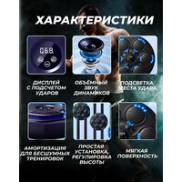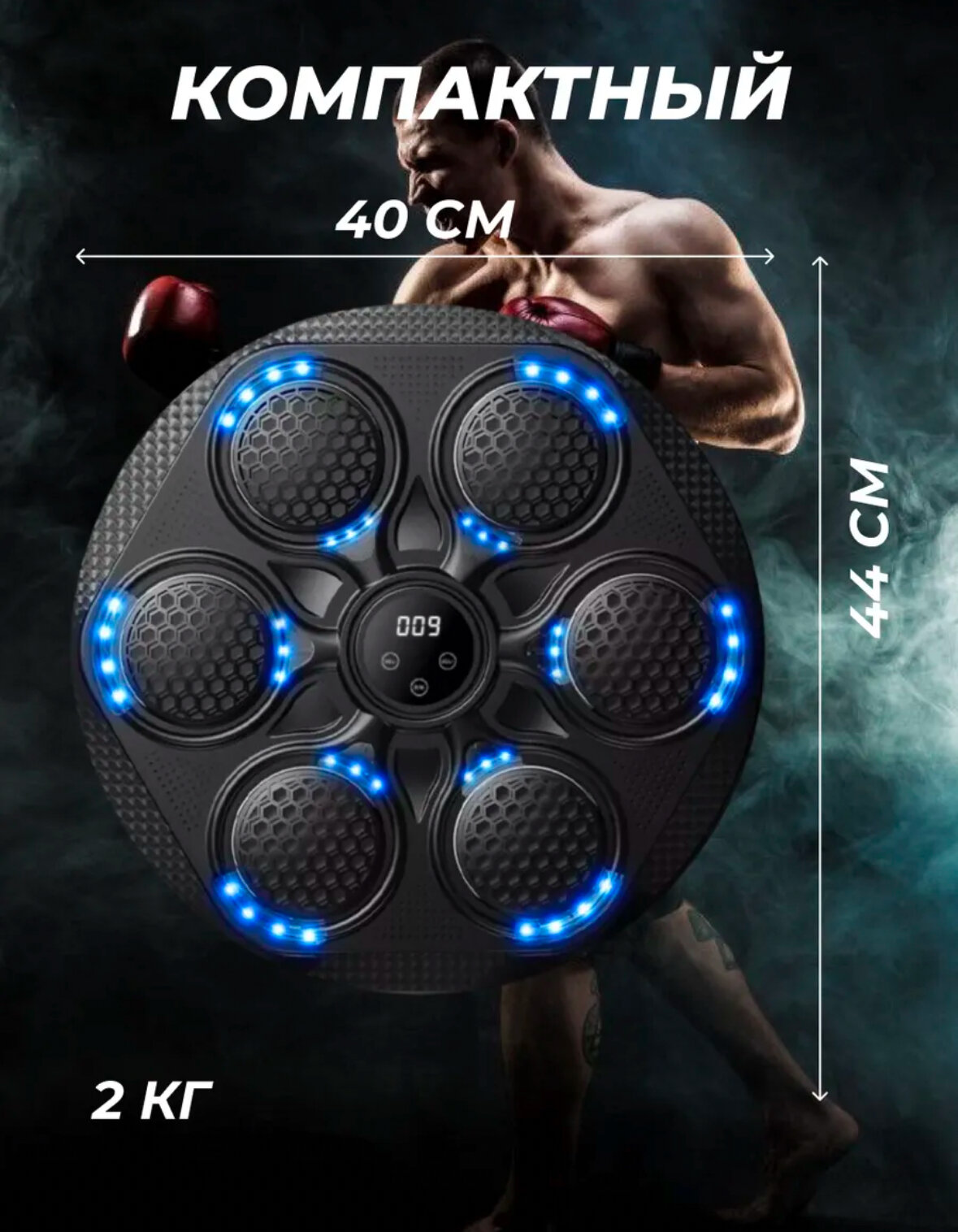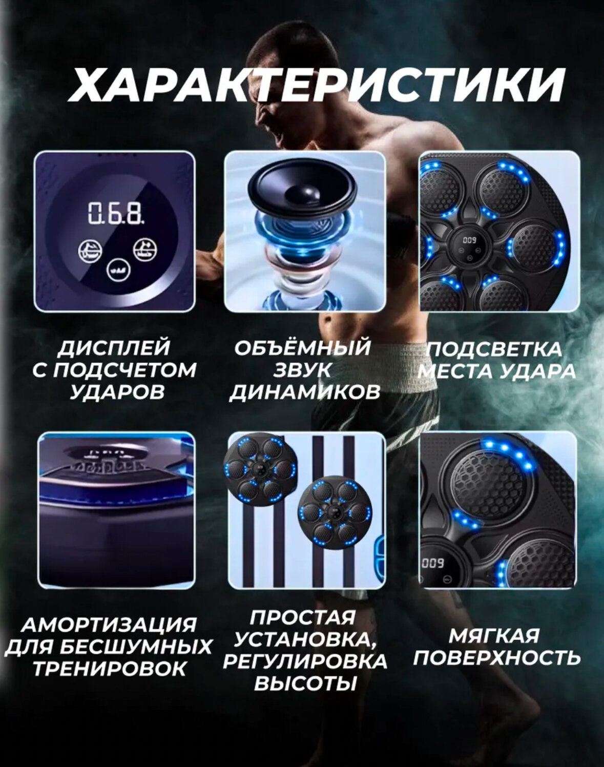 ТРЕНИРОВКА ПРЯМО У ВАС ДОМА! Представляем вам настенный тренажер для бокса – идеальный выбор как для малыша, так и для взрослого. Этот электронный тренажер способствует развитию ловкости, координации и выносливости. Настенный тренажер не займет много места в вашем доме, при этом поможет всегда находиться в форме. Выполнен из прочного abs-пластика и мягкой резины. Крепится вертикально на стену на двусторонний скотч, является заменителем привычной боксерской груши. Имеет несколько скоростей и режимов сложности, оснащена музыкальным сопровождением. Подключить свою музыку вы сможете с помощью Bluetooth. Просто включите умный тренажер и начинайте домашнюю спортивную тренировку. Мишень будет подсвечивать, куда нужно бить. На удар вам дается около 1 секунды. На счетчике боксирования вы увидите их общее количество. Силовой тренажер груша для бокса является достойной альтернативой боксу и другим видам боев. Во время практики прорабатывают мышцы рук, плеч, предплечья и спины, а также укрепляется мышечный корсет, что снижает нагрузку на позвоночник. В подарок идут перчатки MMA. Тренажер идеально подойдет для похудения и прокачки всех мышц, в том числе и ног. Улучшите свои навыки, тренируйтесь с комфортом и радостью каждый день с помощью настенного музыкального тренажера для бокса!