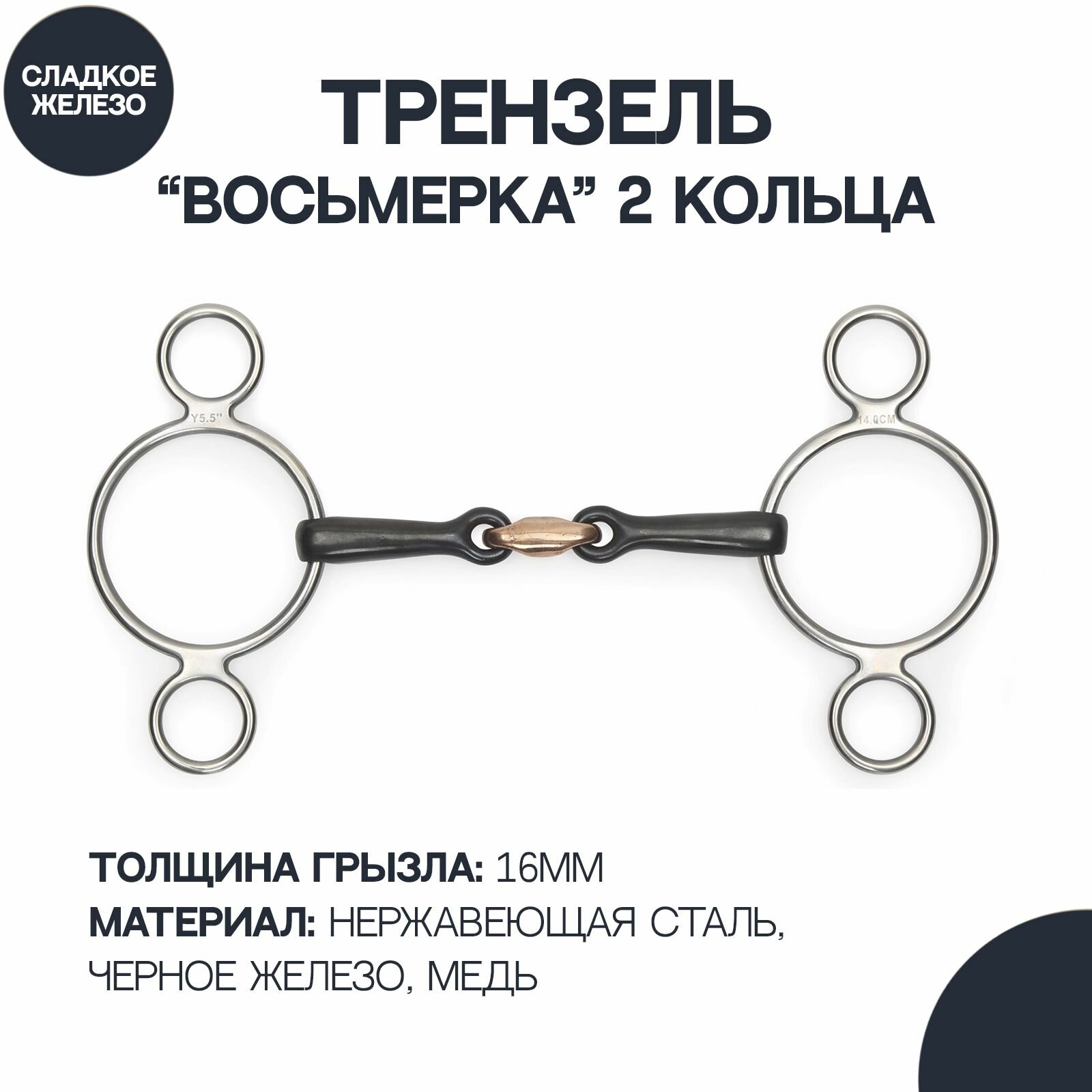 Трензель изготовлен из нержавеющей стали, что обеспечивает его долговечность и устойчивость к коррозии. Сладкое железо и медь, входящие в состав материала, стимулируют лошадь отжевывать, что способствует улучшению пищеварения и общему здоровью животного.