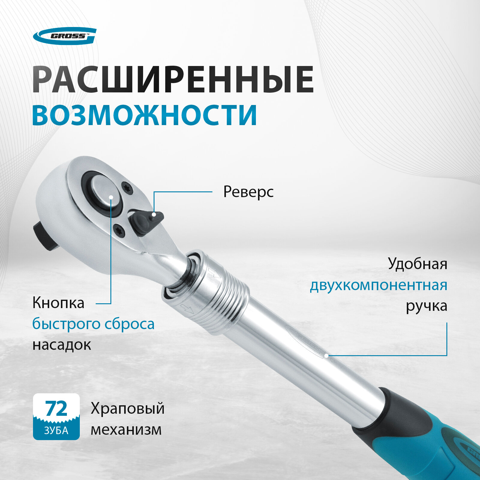 Телескопический хромированный трещоточный ключ Gross 14070, 305-445 мм, из стали CrV, с присоединительным квадратом 1/2 дюйма и 2-компонентной рукояткой, предназначен для монтажных работ с резьбовыми соединениями. Особенно удобен для работы в труднодоступных местах, т. к. имеет запатентованный механизм фиксации телескопической рукоятки. Ее длину можно изменить с 305 до 445 мм. Инструмент используется в слесарных мастерских, автосервисах, пригодится и в быту. ПреимуществаВысокая износостойкость — ключ-трещотка изготовлен из прочной стали хромованадиевой группы. Долговечность — хромированная поверхность устойчива к ржавчине и воздействию агрессивных веществ. Расширенные возможности — реверсивный механизм позволяет использовать инструмент как для закручивания, так и для откручивания крепежей. Легкая замена оснастки — кнопка быстрого сброса упрощает съем и установку насадок. Высокая плавность работы — храповый механизм с 72 зубцами имеет шаг 5 градусов. Надежная фиксация насадки — благодаря присоединительному квадрату с шариком оснастка не соскакивает во время работы. Комфортная эксплуатация — удобная двухкомпонентная ручка надежно ложится в руку и не выскальзывает из ладони.