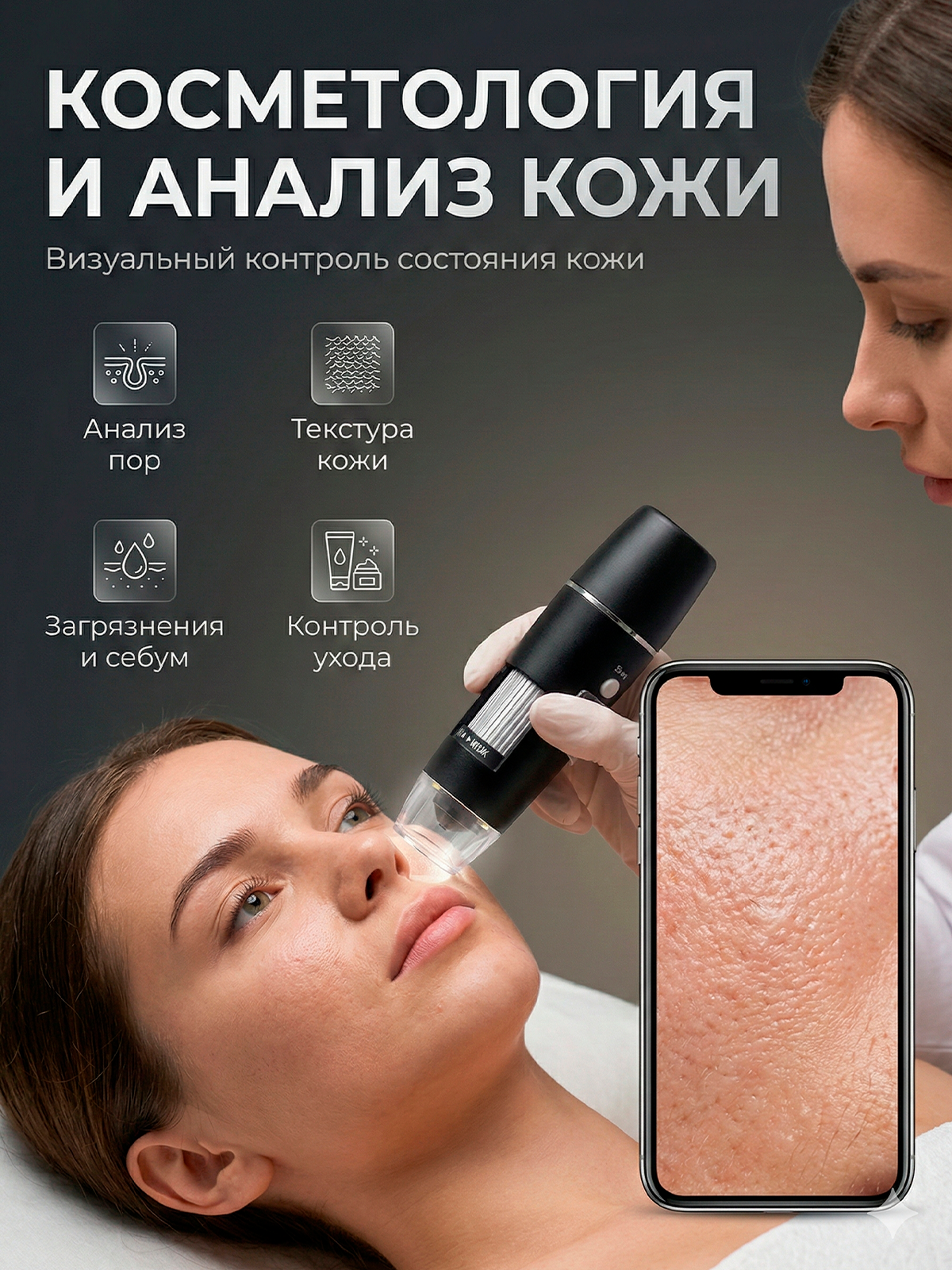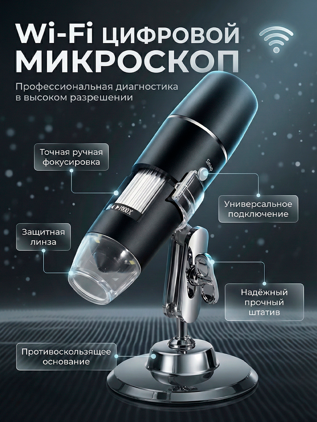 Микроскоп цифровой электронный карманный WiFi - это универсальное портативное мини устройство с возможностью увеличения до 1000х крат. Он обладает четким изображением и простотой удобства управления. Имеет светодиодную подсветку для проведения опытов и познания живого мира или как профессиональный микроскоп с дисплеем для проведения исследования, или как трихоскоп для косметолога. Может использоваться как ручная лупа. Может записывать фото и видео. Применение очень широко. Используется в производственной проверке качества печатных плат, прецизионного оборудования, контроль качества текстильной продукции, состояния кожного покрова, волосяных луковиц, исследование микроорганизмов. Применяется в качестве диффузора и вспомогательного оборудования для чтения. В качестве косметологического трихоскоп для осмотра кожи головы, лица и волос.