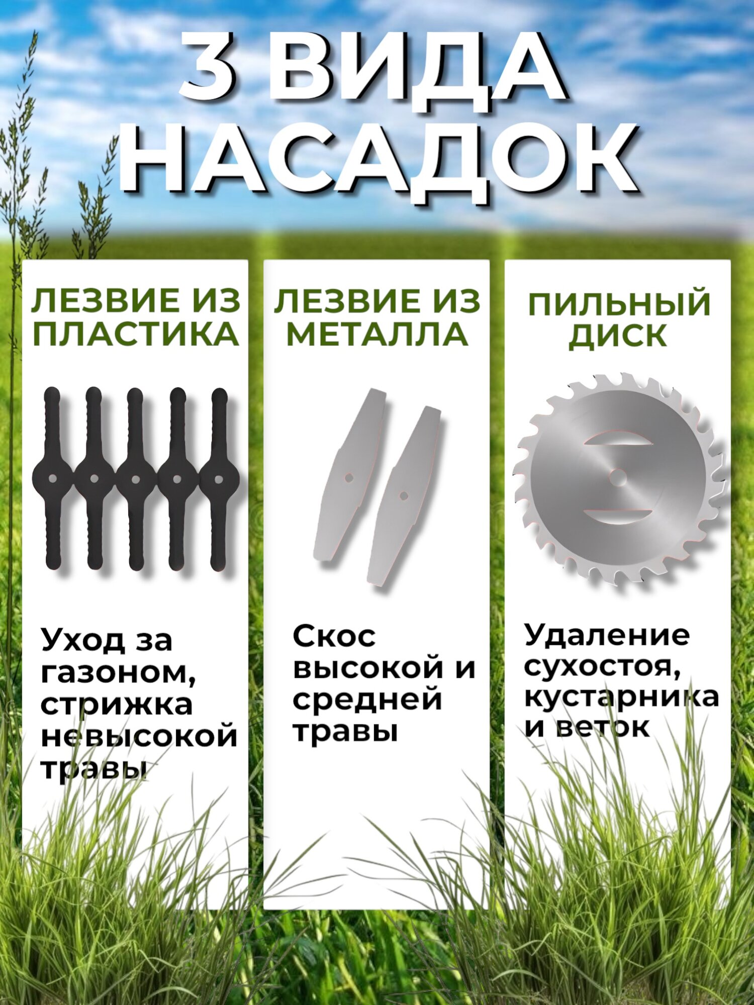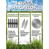| Дополнительная информация | Триммер комплектуется мощными 2-мя Li-Ion аккумуляторами с мощностью 21 В, что позволяет работать без перерыва на 1 аккумуляторе, пока 2 заряжается. Регулируемая по высоте ручка обеспечит максимальный комфорт в работе и снимет лишнее напряжение с поясницы. Головка триммера имеет фиксацию в 3 положениях под разными углами, что позволит вам без труда использовать ее в различных областях применения. азонокосилка имеет в комплекте 8 насадок (5 пластиковых ножей из износостойкого пластика, 2 острых лезвия для сорняков т толстой травы и осоки и 1 металлический диск для толстых кустарников, веток и сильно заросшей поверхности. Косилка аккумуляторная оснащена модернизированным, мощным двигателем, выдерживающим сильные нагрузки и позволяющий работать длительное время без остановки. Так же данный двигатель имеет максимально низкий уровень шума, благодаря чему ваш скос травы станет практически бесшумным для окружающих. |