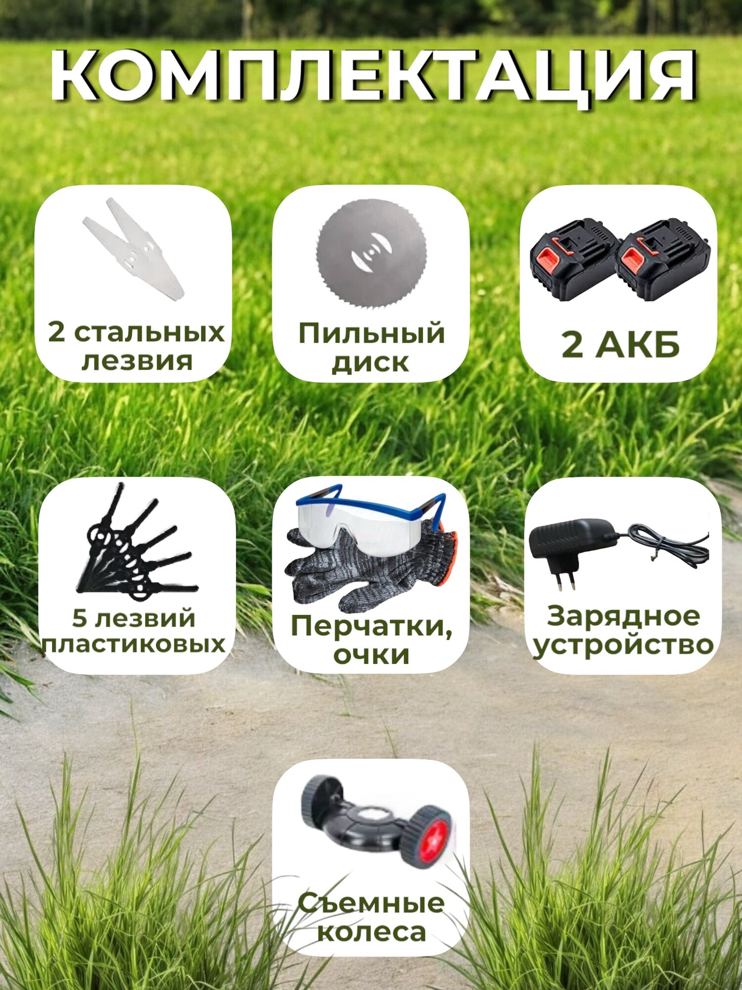 | Подробная комплектация | Триммер: 1 шт; Аккумуляторы: 2 шт; Зарядное устройство: 1 шт; Съемные колеса; Насадки: 8 шт; Защитные очки: 1 шт; Трубчатый ключ: 1 шт; Защитные перчатки: 1 пара; Ручка держатель: 1 шт. |
