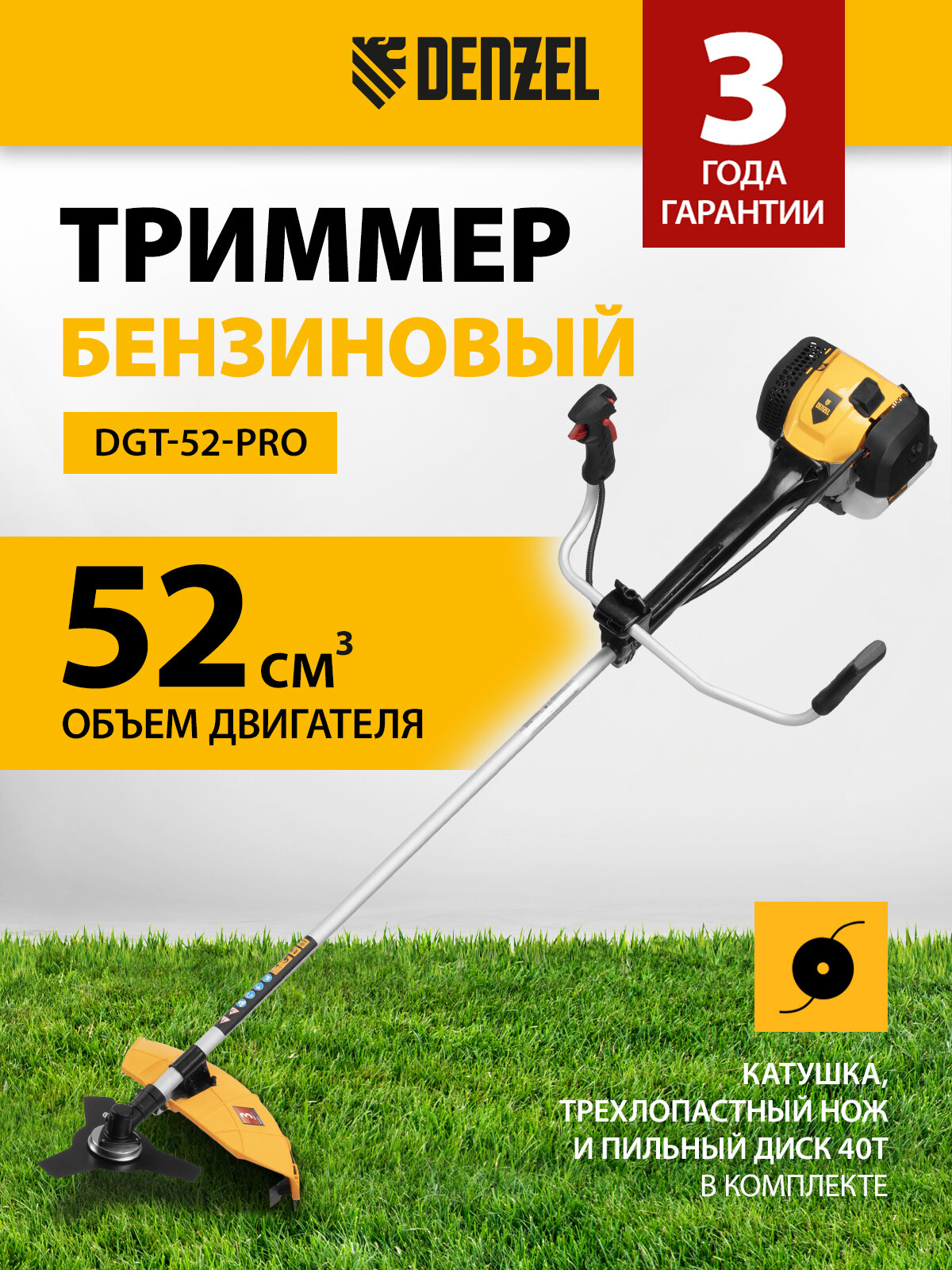 Бензиновый триммер Denzel DGT-52-PRO 96278 с системой анти-вибро и неразъемной штангой, состоит из 2 частей и оснащен мощным двигателем объемом 52 куб. см. Способен скашивать не только газонную траву, но и растительность с жесткими древовидными стеблями (полынь, крапиву, лебеду, борщевик) а также срезать кустарник и молодые побеги деревьев со стволами диаметром до 10 мм. Для этих целей предназначены полуавтоматическая катушка с леской, трехлопастный нож и пильный диск.