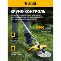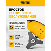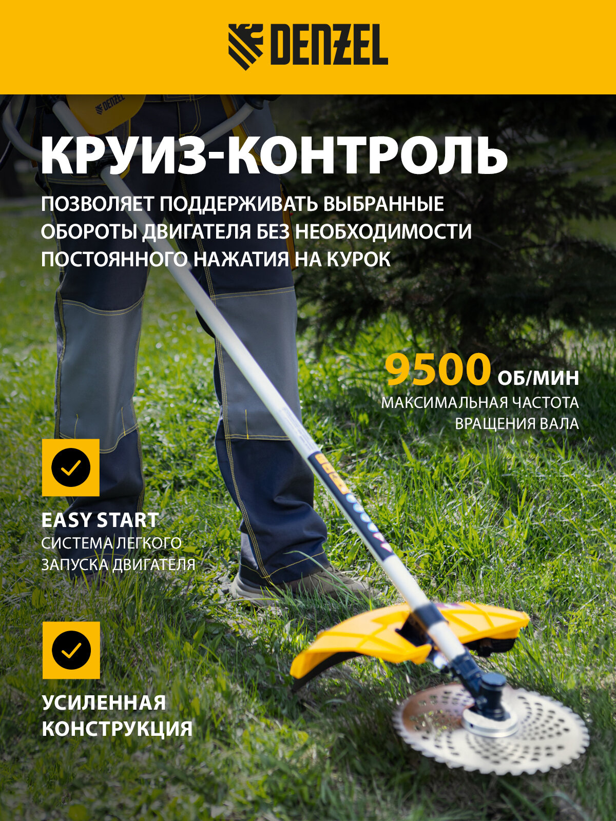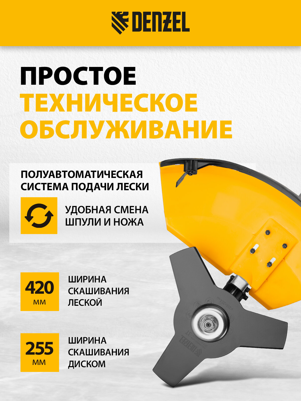 - Дополнительные возможности — можно приобрести и установить на триммер диск Denzel 96323 с шириной скашивания 230 мм для быстрого удаления растительности с жесткими стеблями, 96328 для скашивания молодых побегов кустарника диаметром до 3 мм.