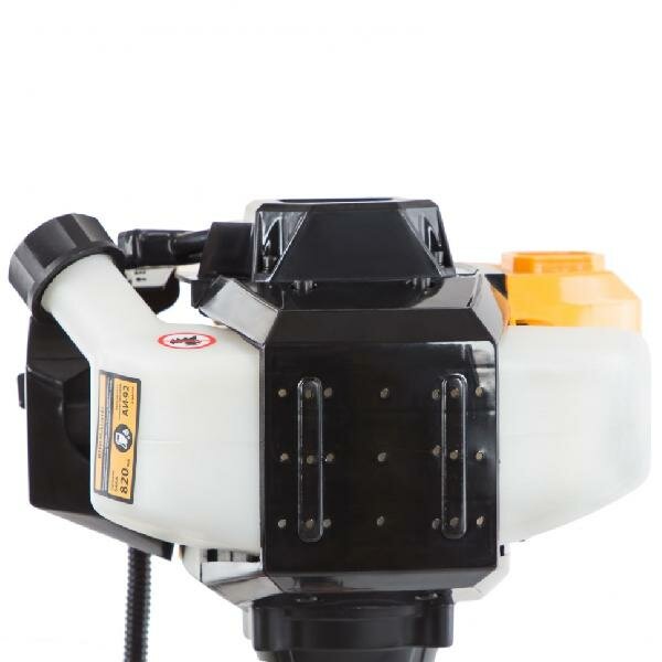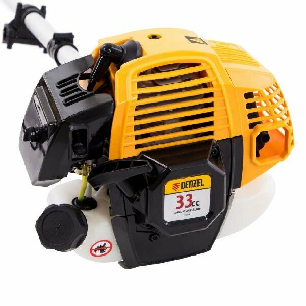 Двухтактный одноцилиндровый двигатель не зависит от электросети , а потому триммер станет отличным помощником в местах с перебоями в электричестве. Топливная смесь готовится из бензина и масла, это значит, что достаточно ее смешать в удобном дозаторе, который входит в комплект и залить в топливный отсек.