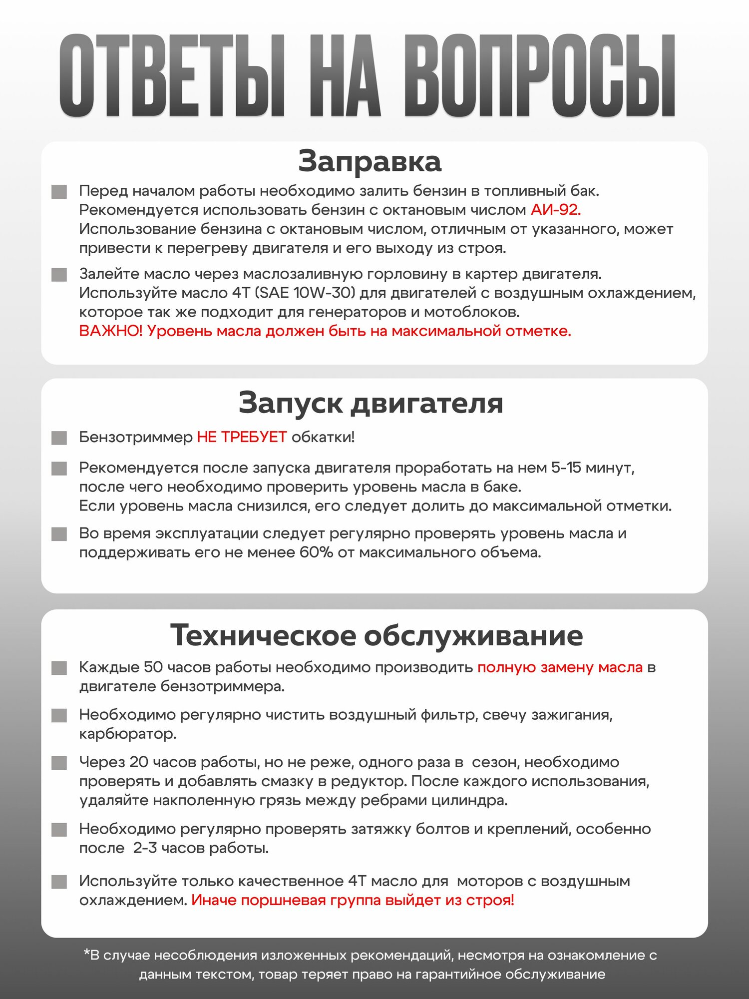 | Подробная комплектация | Бензиновый триммер - 1 шт Нож 3Т - 1 шт Нож 40Т - 1 шт Катушка под леску - 1 шт Емкость для топливной смеси - 1 шт Наплечный ремень - 1 шт Набор инструментов - 1 шт Защитный кожух - 1 шт |