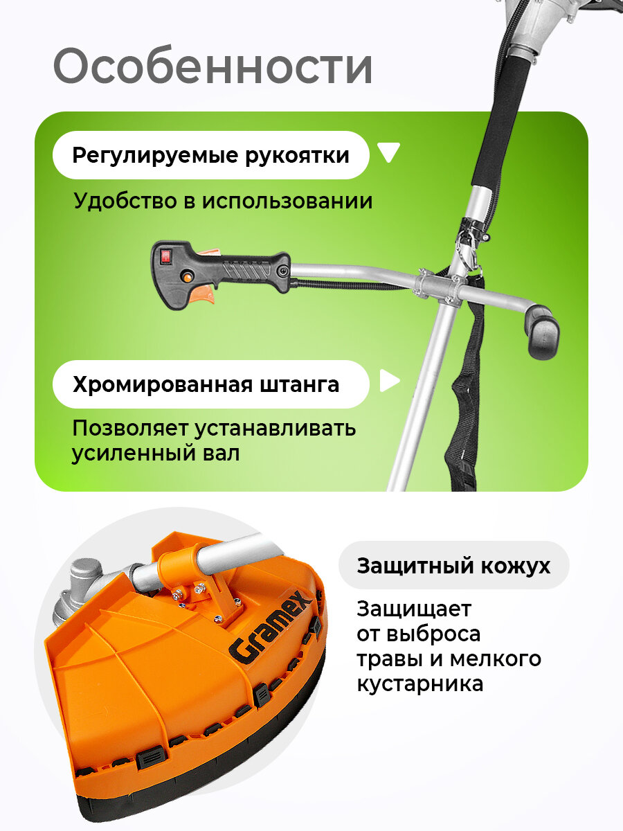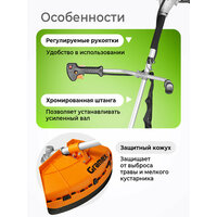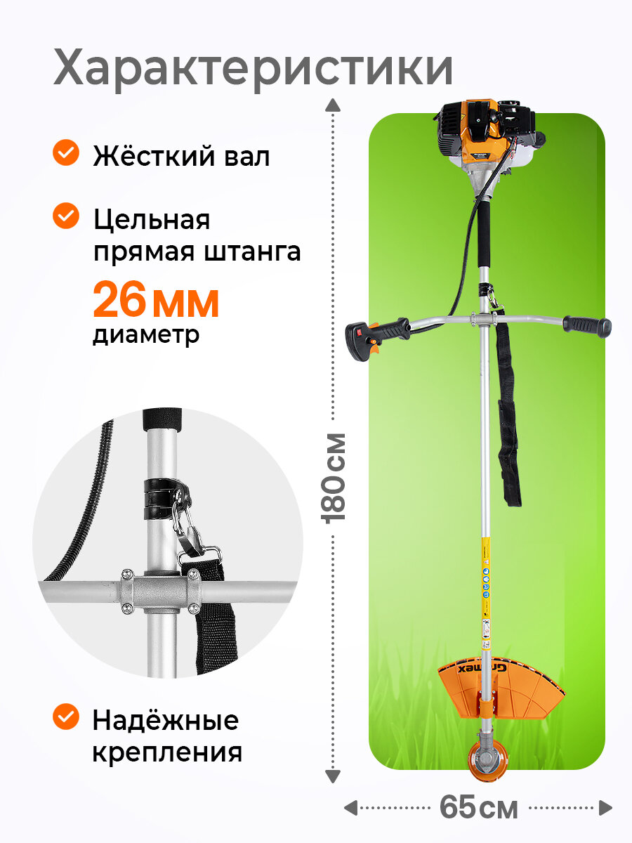 | Подробная комплектация | Триммерная головка из нейлона BASF, диск-кусторез, удобный плечевой ремень |