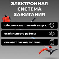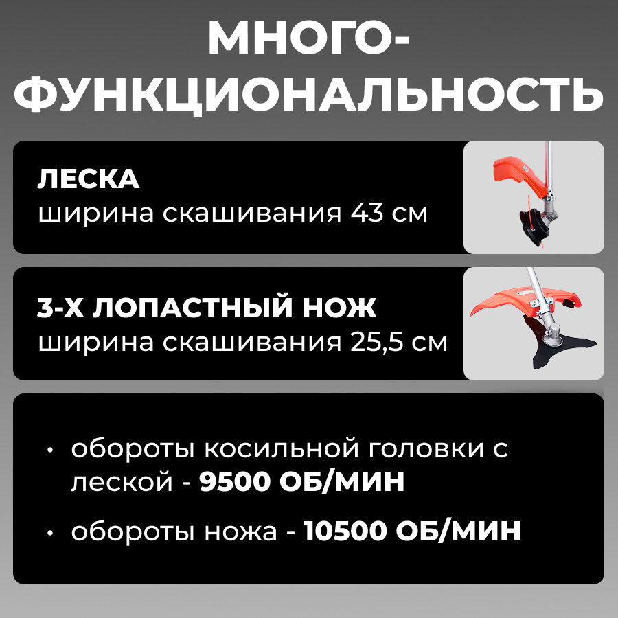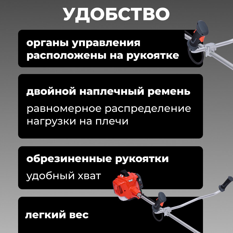 | Подробная комплектация | Защитный кожух; ёмкость для топливной смеси; наплечный ремень; косильная головка; леска триммерная; металлический нож; |