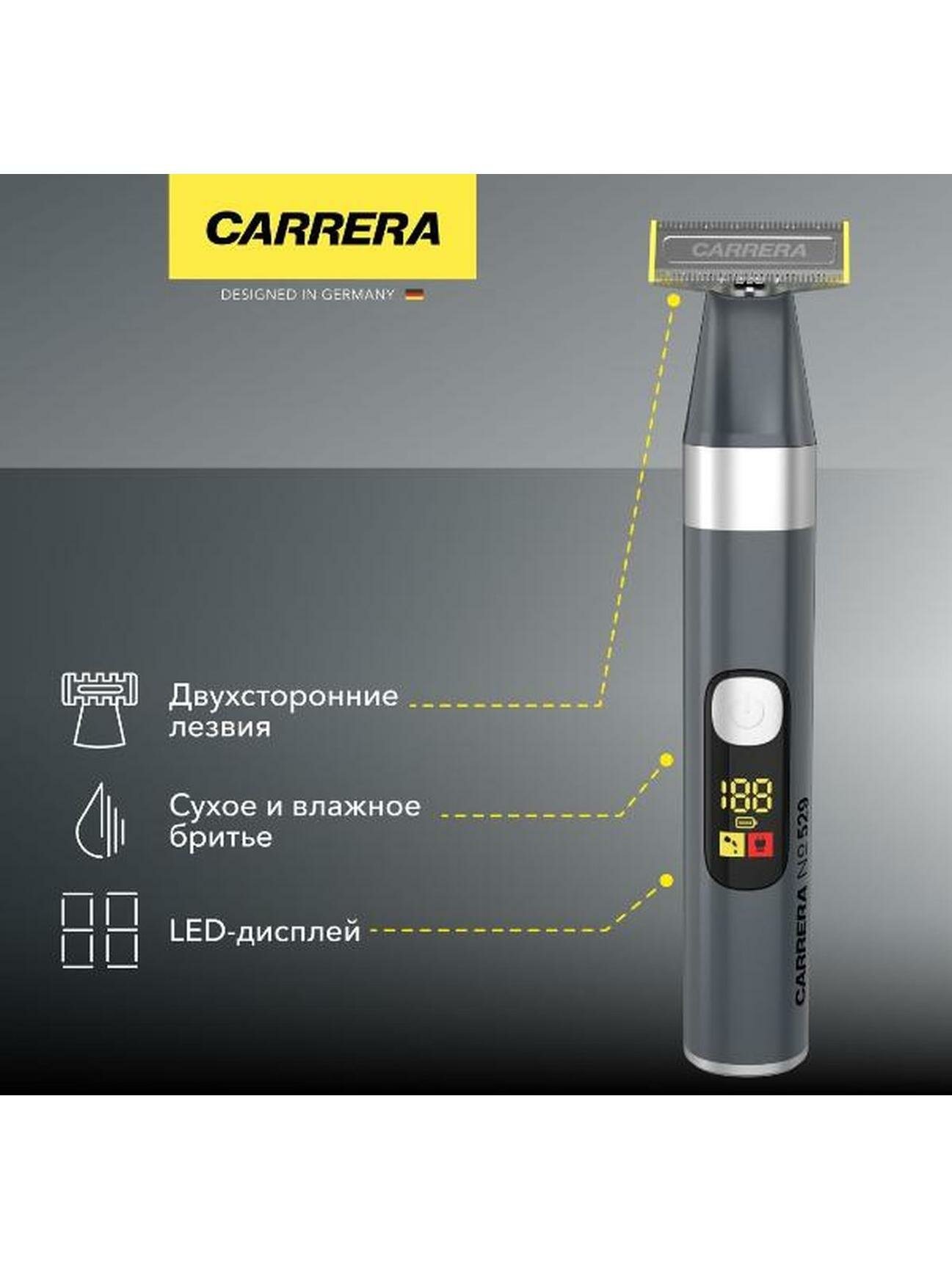 Зарядка от USB-порта; Дисплей; Индикация включения; Индикация длины стрижки; Насадки в комплекте: насадка для носа и ушей, триммер для бороды, триммер для тела; Дополнительно в комплекте: щеточка для чистки, чехол, масло для смазки, зарядное устройство, лезвие, usb-кабель
