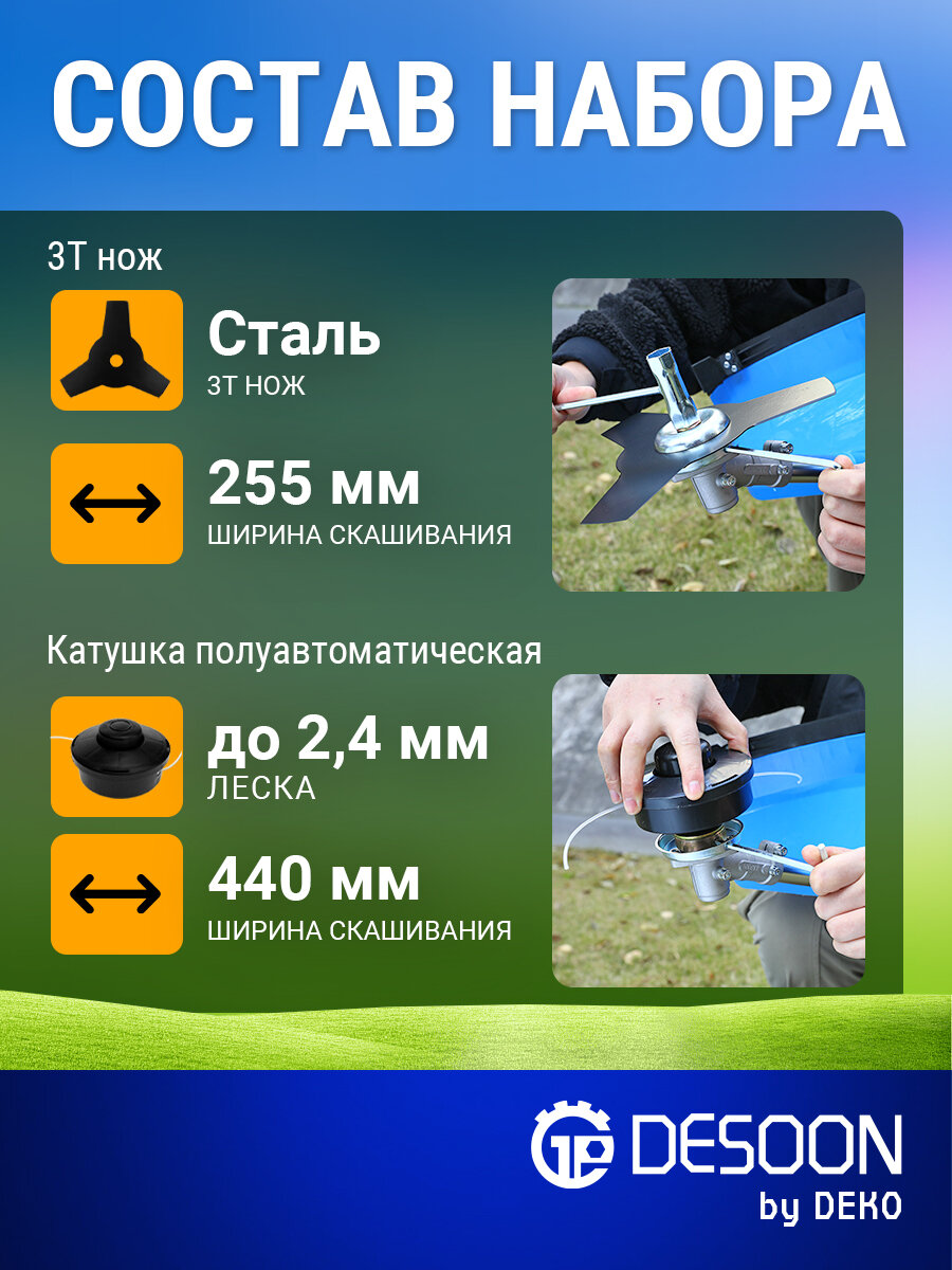 | Подробная комплектация | 3Т нож - 1 шт Емкость для топлива - 1 шт Плечевой ремень - 1 шт Комбинированный ключ - 1 шт Шестигранный ключ - 2 шт Двусторонний гаечный ключ - 1 шт Отвертка - 1 шт Соединительная пластина - 1 шт Нож для обрезки лески - 1 шт Крепежный комплект (винты - 8 шт, шайбы - 12 шт) - 1 шт Руководство по эксплуатации - 1 шт |