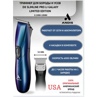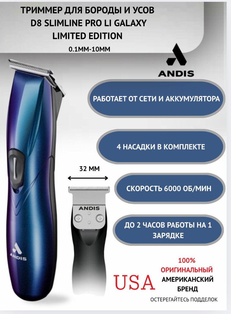 Купить Триммер для стрижки волос Andis D-8 Slimline Pro Galaxy, нож 32 мм, 0.1 мм, аккум/сетевой, 2.45 Вт, 4 насадки 561561 D-8 с доставкой по всей России.