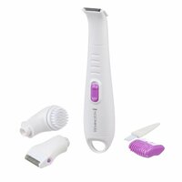 Детальный триммер с лезвиями. Регулируемая насадка-гребень (2-6 мм). Бритва с нано-серебряным покрытием. Насадка-пилинг для зоны бикини. Прорезиненная ручка., щёточка для чистки, сумочка