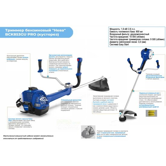 | Подробная комплектация | Триммер бензиновый НЕВА Мототехника BCK853GU PRO кусторез 4650002231467 1 шт. |
