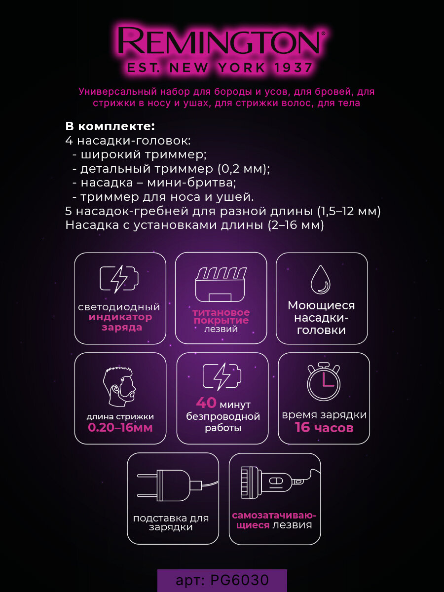 Триммер Remington PG6030, Лезвия с покрытием из титана, детальный триммер (0,2 мм), до 40 мин работа: сравнение цен, характеристики, фото, актуальное наличие и цены.
