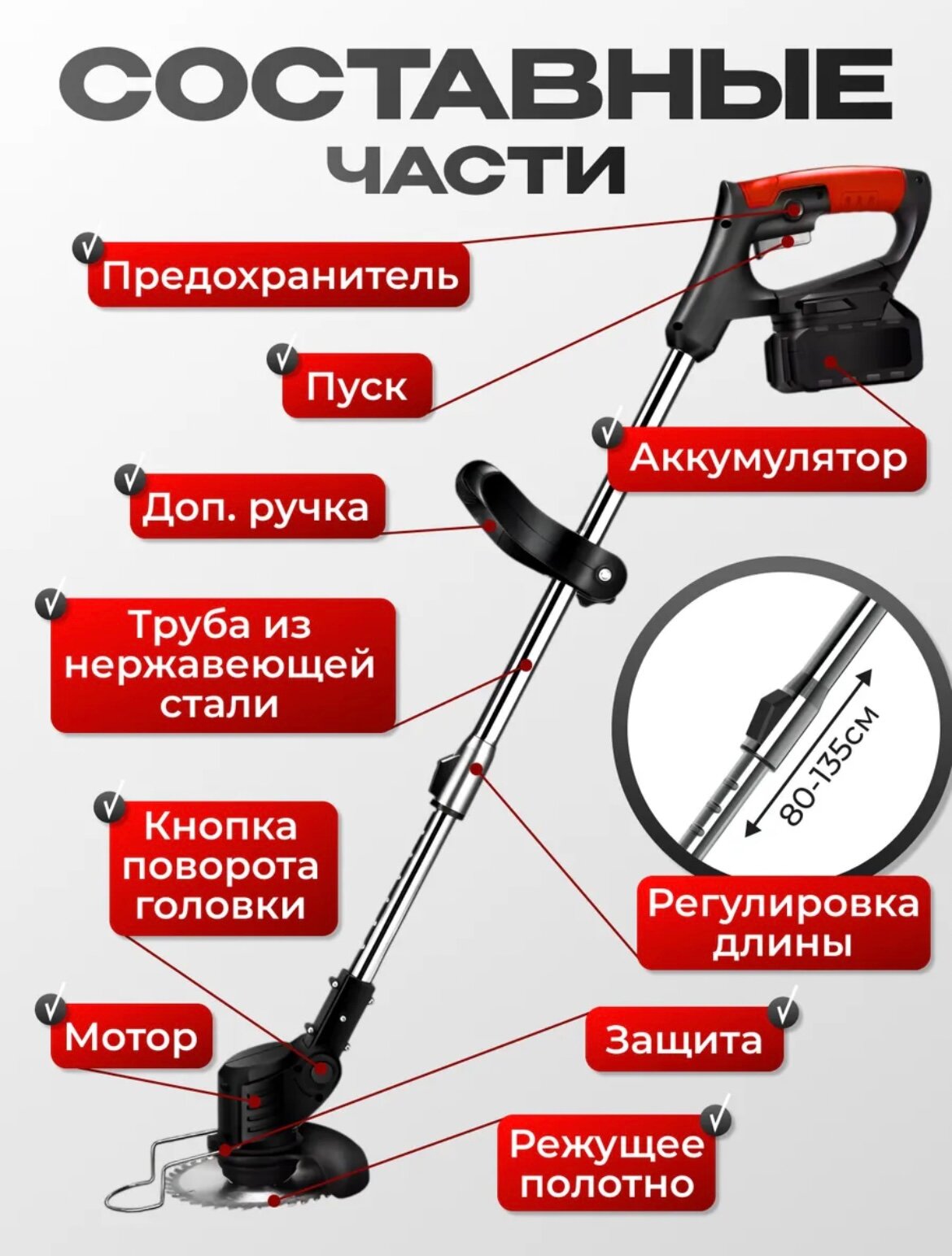 | Подробная комплектация | Триммер для травы - 1 шт.; Аккумулятор - 2 шт.; Зарядное устройство - 1 шт.; Пильный диск - 1 шт.; Пластиковые лезвия - 5 шт.; Металлические лезвия - 2 шт.; Ключ - 1 шт. |