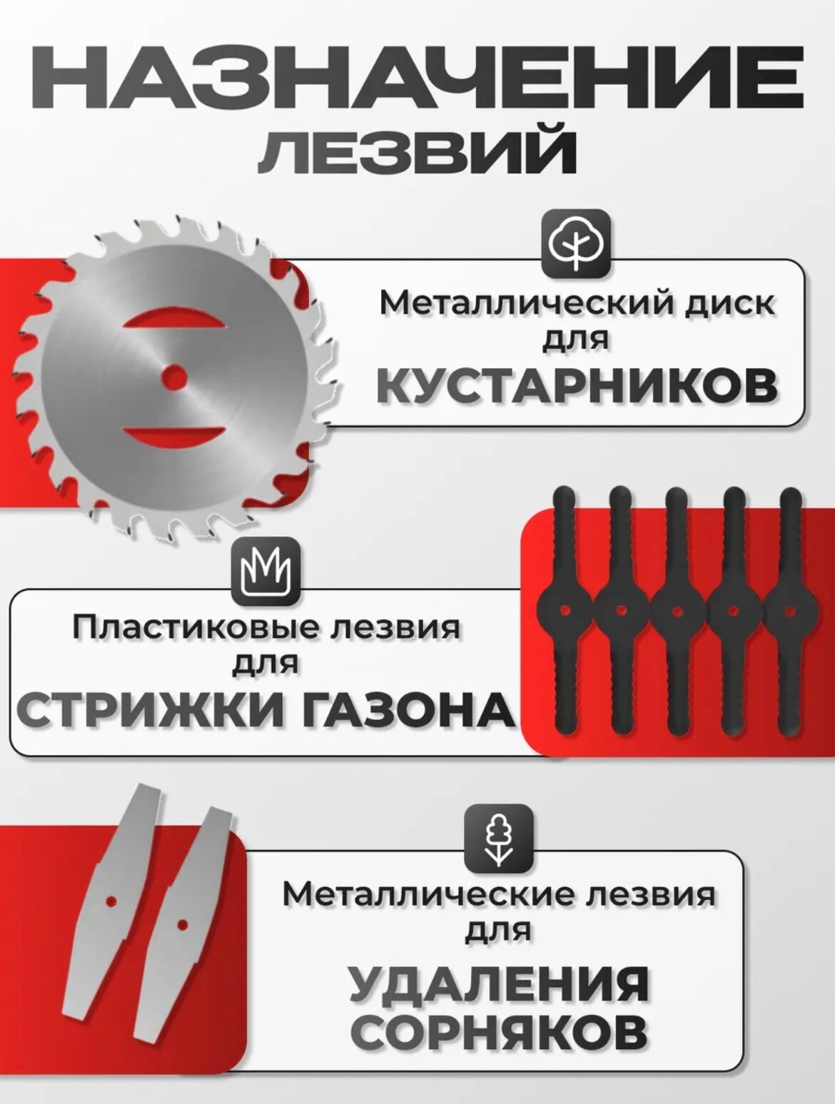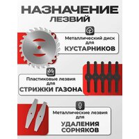 | Дополнительная информация | Пильный диск предназначен для резки кустов, а пластиковые ножи отлично подойдут для стрижки газонов, создавая ровный и аккуратный срез во время покоса. |