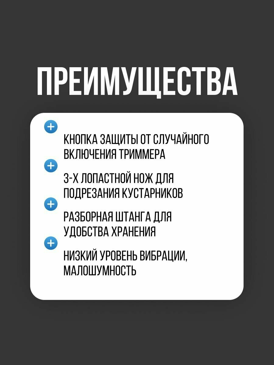 | Дополнительная информация | количество оборотов леска/нож, 7000/ 8100 об/мин; ширина среза/диаметр (нейлоновая леска) 430 мм/2,4 мм; ширина среза/толщина (лезвие 3Т) 255 мм/1,4 мм; модель двигателя IC 26 |