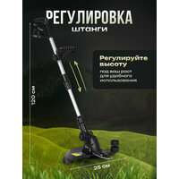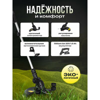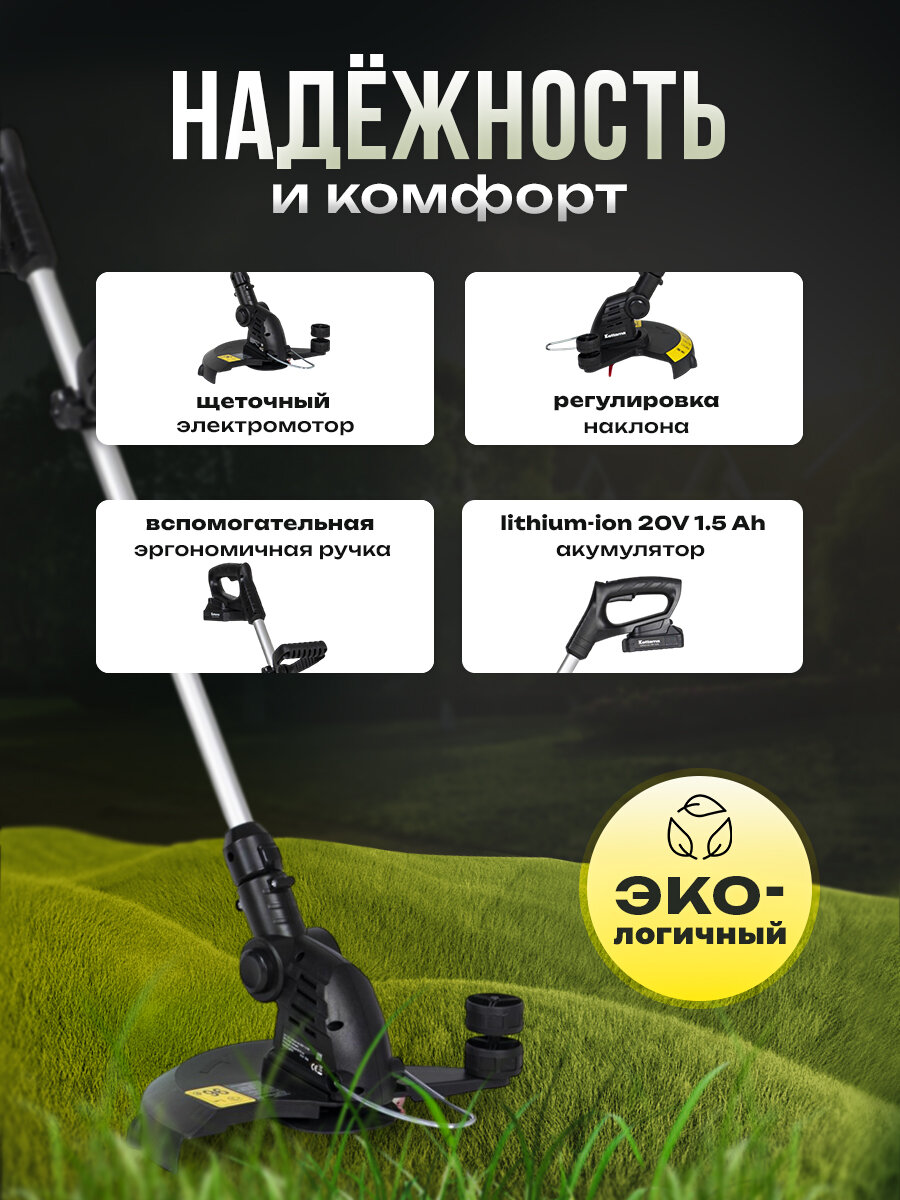 Триммер работает от литий-ионного аккумулятора 20 В 1,5 Ач — это обеспечивает мобильность и отсутствие привязки к розетке. Эргономичный дизайн и малый вес (всего 3 кг) делают его удобным для работы даже в течение длительного времени. Уровень звуковой мощности — 92 дБ (А), что соответствует стандартам и позволяет комфортно использовать инструмент на приусадебном участке.
