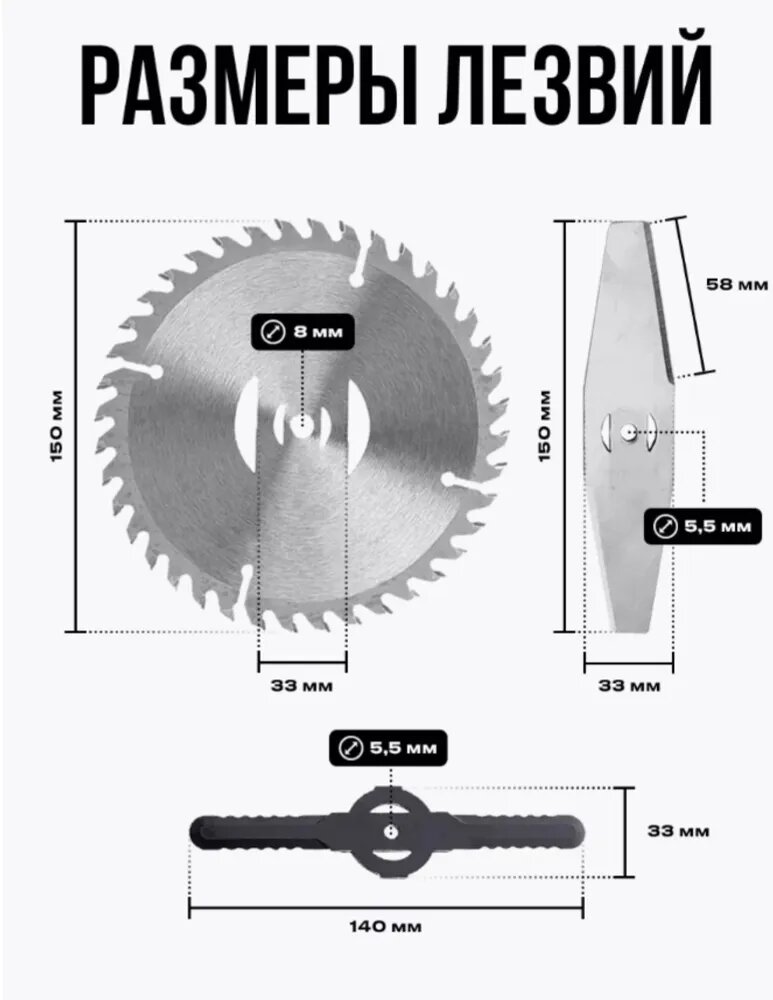 | Подробная комплектация | Триммер для травы - 1 шт.; аккумулятор - 2 шт.; Зарядное устройство - 1 шт.; пильный диск - 1 шт.; Пластиковые лезвия - 5 шт.; Металлические лезвия - 2 шт.; Ключ - 1 шт.; перчатки - 1 пара; очки - 1 шт. |