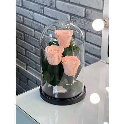 Вечная Роза в колбе Трио «Премиум» в подарочной коробке с вау эффектом в персиковом оттенке! 27 см Наши стабилизированные цветы не завянут 5 лет! Стабилизированные розы, выращены на плантациях Эквадора и срезанных на пике цветения, прошли процесс стабилизации, который замораживает процесс старения цветка, листьев и стеблей. Такая технология сохраняет эластичность и свежесть цветов до 5 лет!