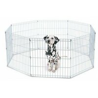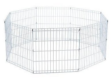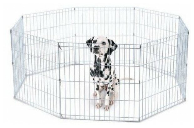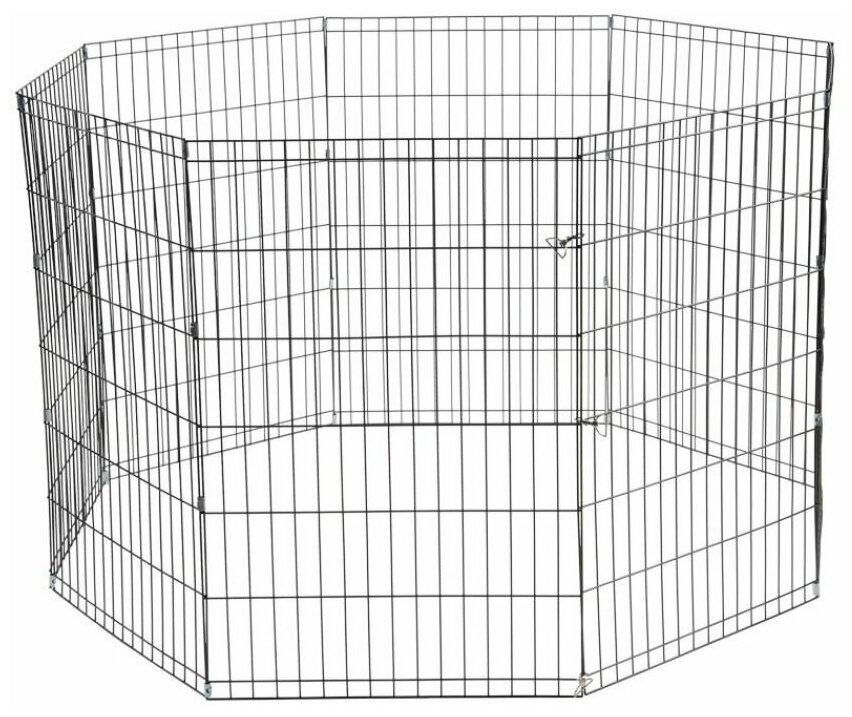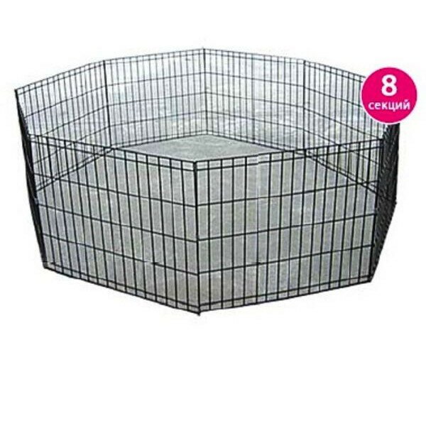 Секции соединены между собой при помощи металлических скоб. Из панелей можно собрать ограждение для Вашего животного любой формы. Подходит для кошек, собак, кроликов и других животных. Вольер идеально подходит для отдыха на природе и ограничения передвижения по квартире.