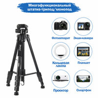Этот штатив для фотоаппарата, камеры и телефона создан для удобной и стабильной работы в любых условиях. Он подходит как для студийной, так и для уличной съёмки, а его компактный и лёгкий дизайн делает его отличным выбором для путешествий и повседневного использования. Благодаря максимальной рабочей высоте в 165 см и возможности сжаться до 50,5 см, этот штатив легко подстраивается под различные сценарии съемки, будь то для пейзажной фотографии или видео-блогов.