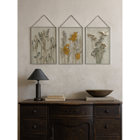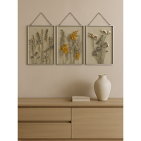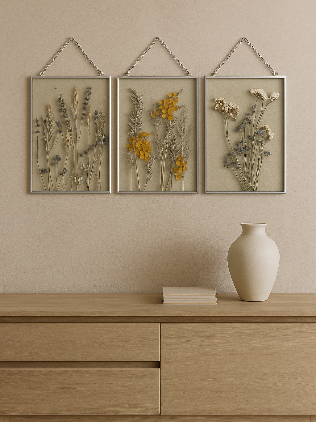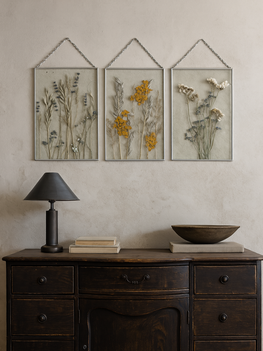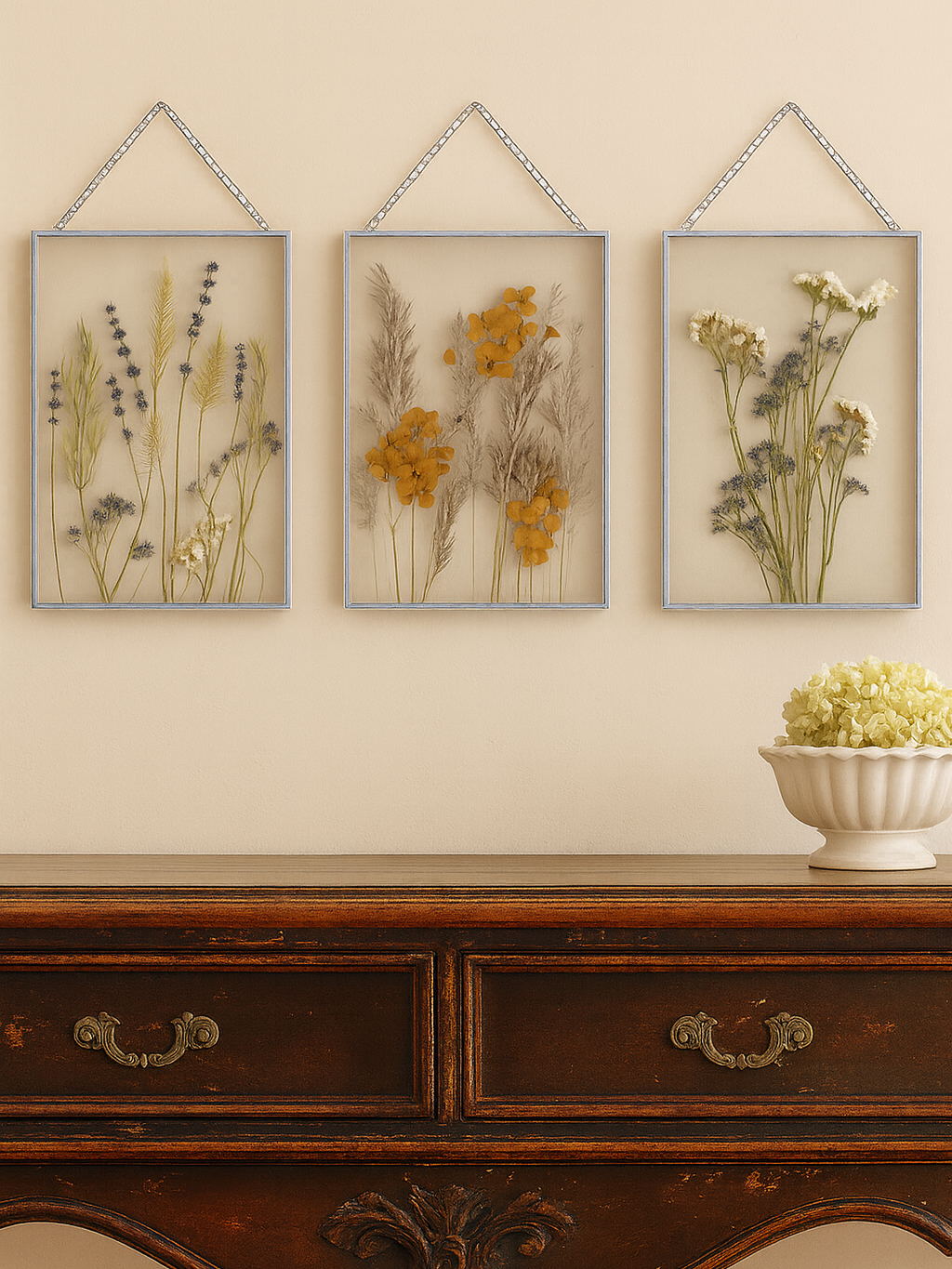 Набор из трёх панно с настоящими полевыми цветами, собранными вручную и бережно запаянными между прозрачными стеклами. Каждое растение сохранено в своей естественной красоте, отражая философию ваби-саби — гармонию в несовершенстве природы.