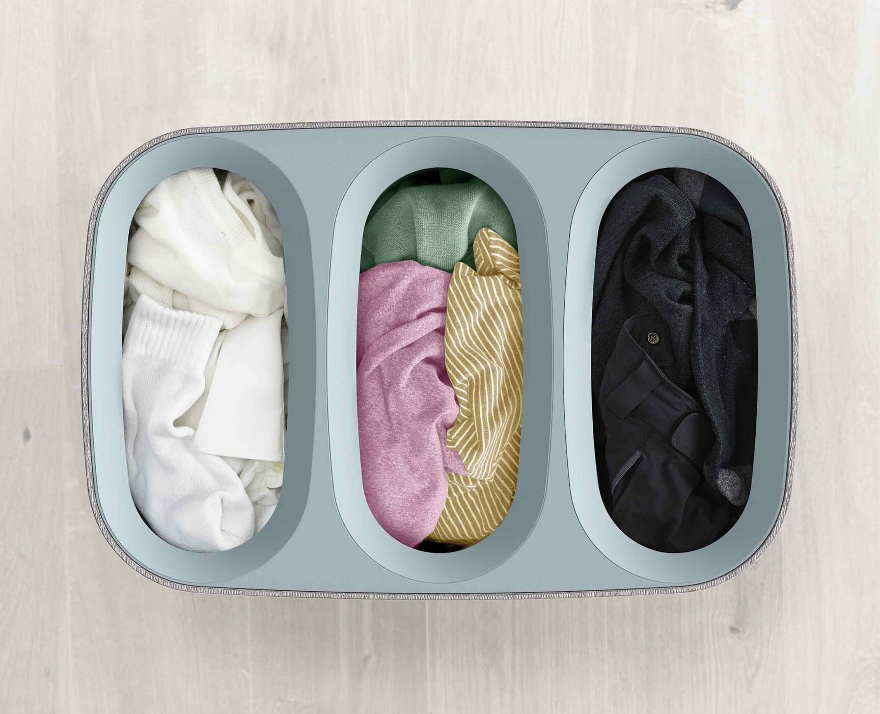 Самая популярная корзина для белья от бренда Joseph Joseph – модель Tota – стала еще более удобной! Теперь три отделения для удобной сортировки грязного белья и легкого переноса большого объема к стиральной машине.
