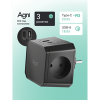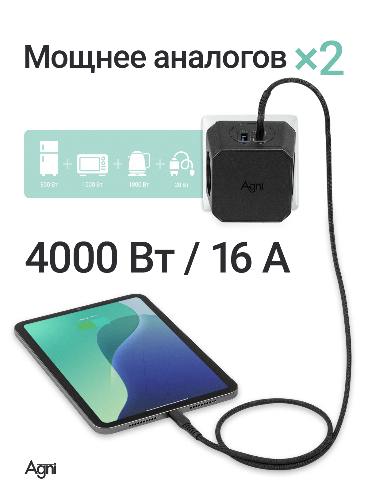 Купить Тройник для розетки, AGNI, быстрая зарядка, разветвитель на 3 гнезда + USB-A и TYPE-C с доставкой по всей России.