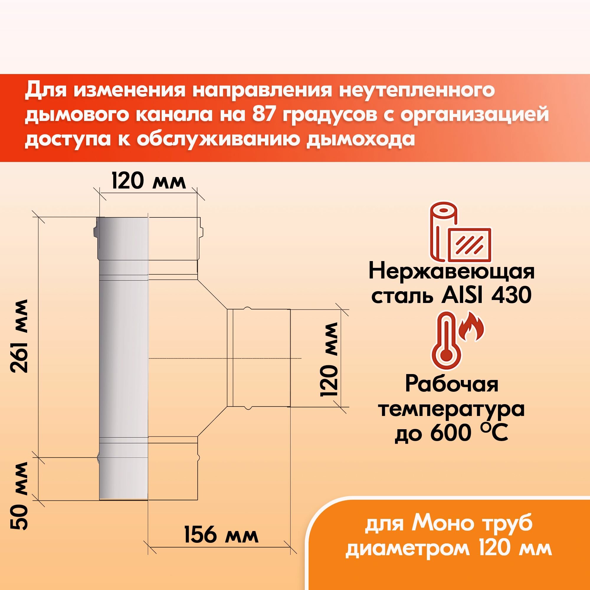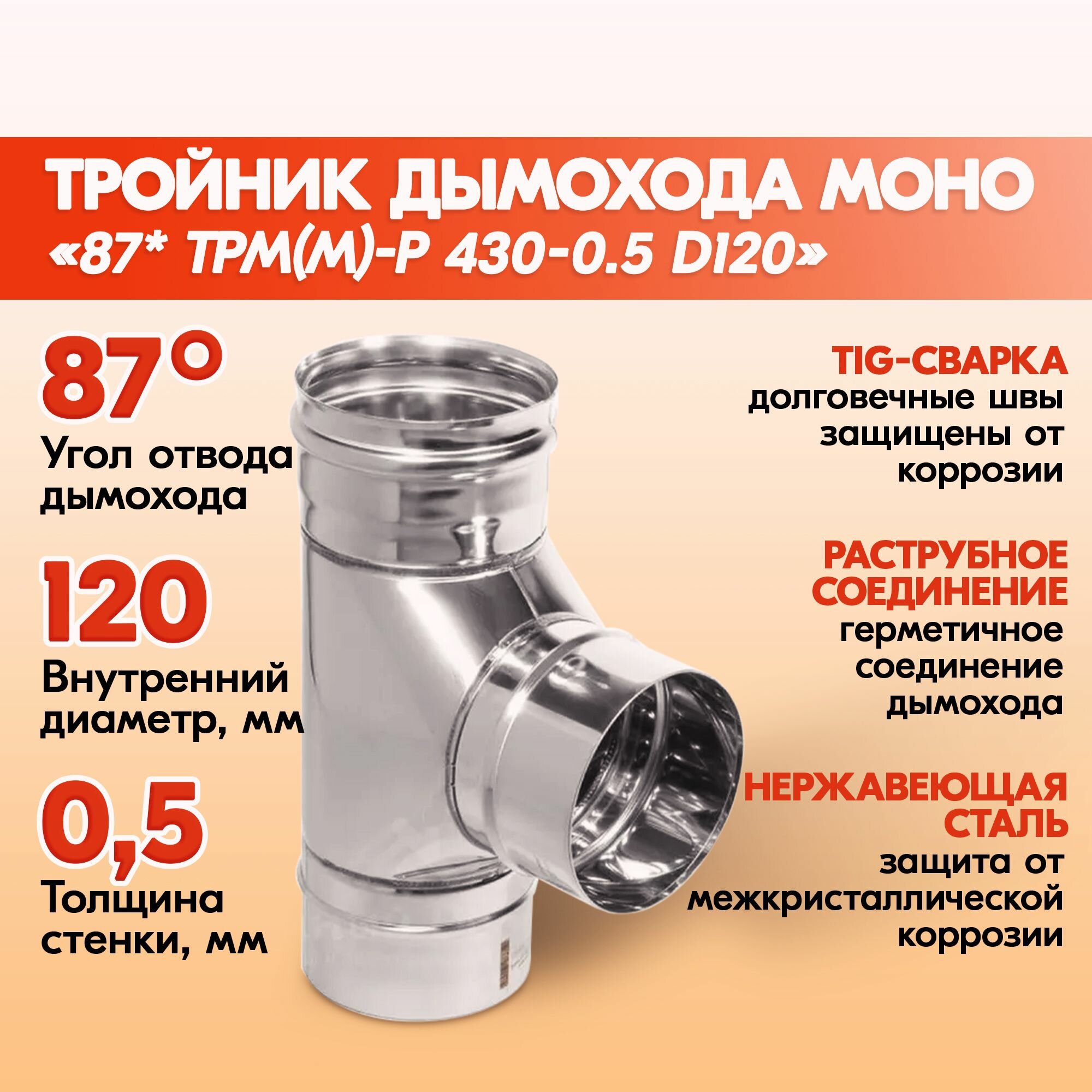 Тройник дымохода Моно 87 градусов ТРМ(М)-Р 430-0.5 D120 одноконтурный из нержавеющей стали: сравнение цен, характеристики, фото, актуальное наличие и цены.