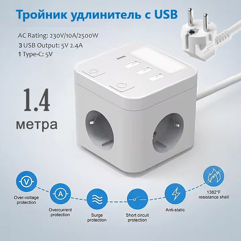 Этот разветвитель представляет собой уникальное устройство, объединяющее в себе сразу 3 розетки переменного тока, 3 порта USB (QC 18 Вт) и 1 порта Type-C (PD 22 Вт). Он идеально подходит для одновременного подключения различных устройств, таких как компьютеры, мобильные телефоны, планшеты и другие гаджеты с USB-портами. Розетка обладает исключительной бесшумностью, что делает ее использование приятным и комфортным.