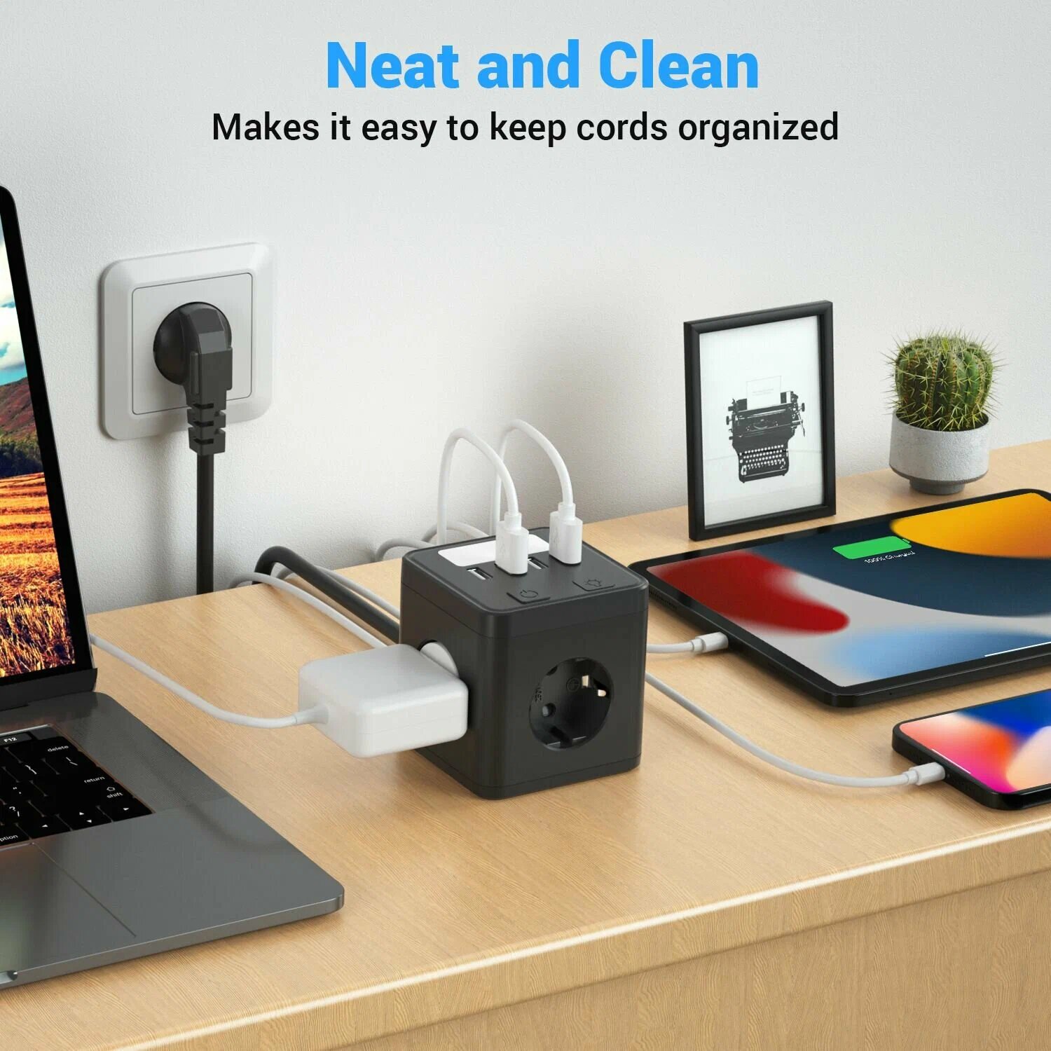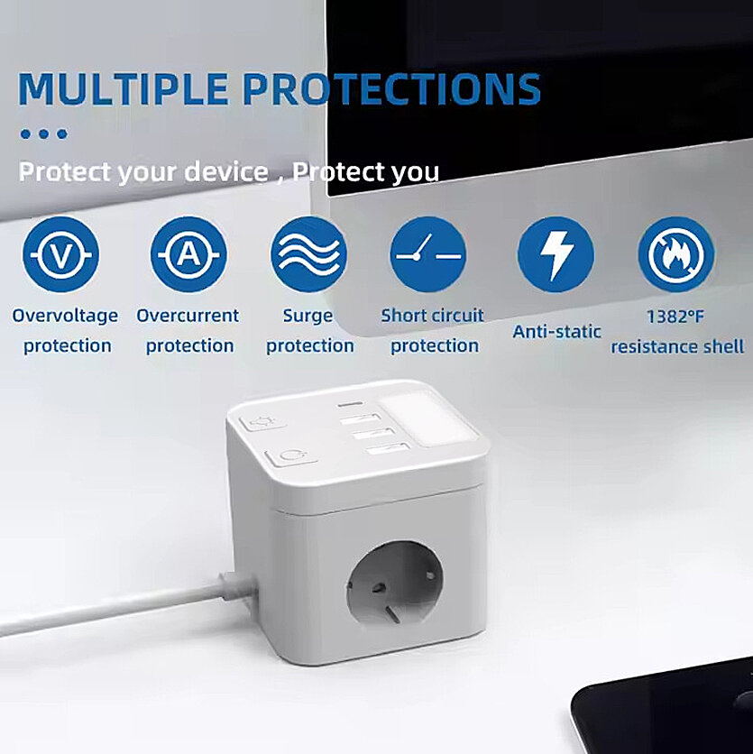 Этот разветвитель представляет собой уникальное устройство, объединяющее в себе сразу 3 розетки переменного тока, 3 порта USB (QC 18 Вт) и 1 порта Type-C (PD 22 Вт). Он идеально подходит для одновременного подключения различных устройств, таких как компьютеры, мобильные телефоны, планшеты и другие гаджеты с USB-портами. Розетка обладает исключительной бесшумностью, что делает ее использование приятным и комфортным.