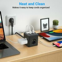 Уникальная конструкция разветвителя позволяет одновременно подключать три большие розетки, три порта USB и один порт Type-C, не препятствуя использованию соседних розеток.