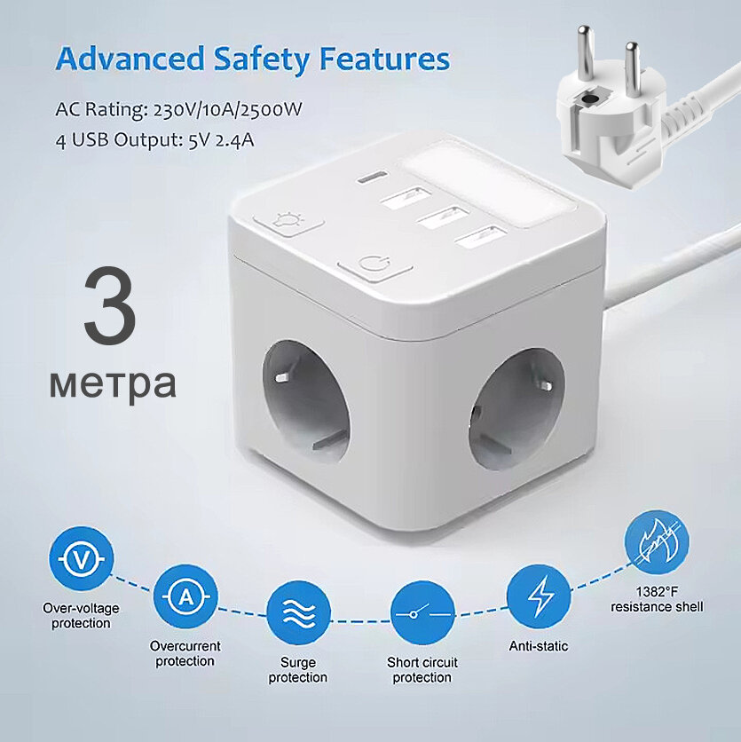 Максимальная мощность разветвителя составляет до 2500 Вт, что обеспечивает надежную защиту ваших электроприборов. Корпус устройства изготовлен из огнестойкого материала ПК, выдерживающего температуру до 750°C, что гарантирует безопасность и исключает возможность возникновения пожара. Кроме того, он оснащен защитой от детей, что делает его использование еще более безопасным и надежным.