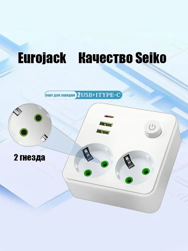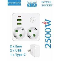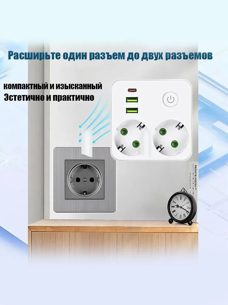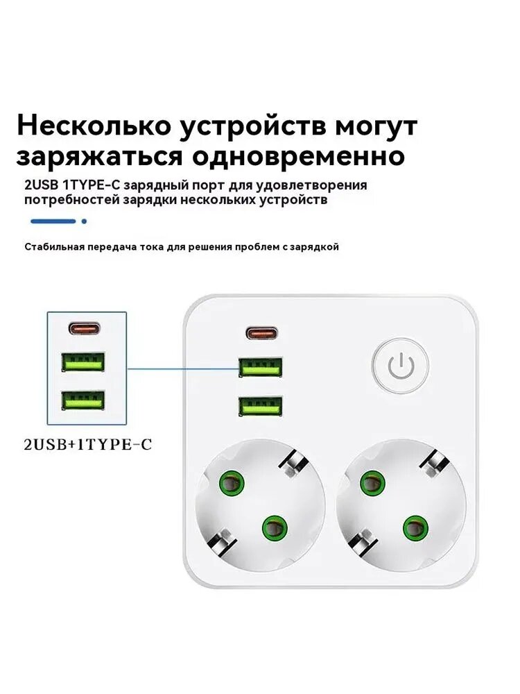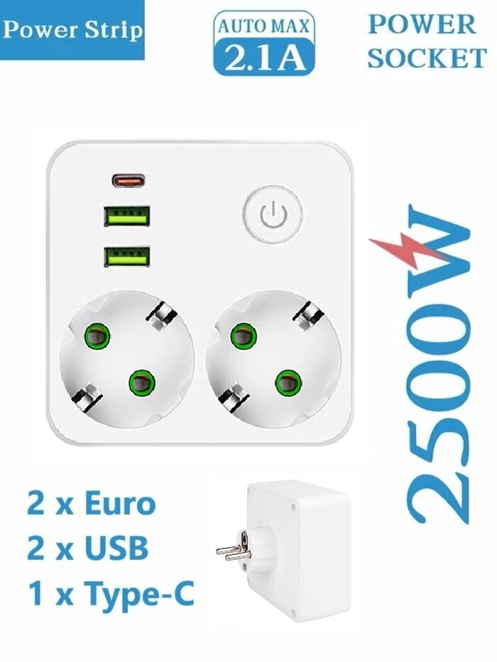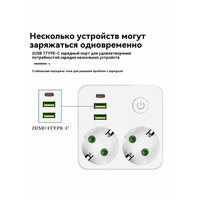 Разветвитель состоит из 2 розеток переменного тока + 2 порта USB (QC 18 Вт) + 1 порт Тип C (PD 22 Вт). Тройник имеет 2 розетки, 2 порта USB и 1 порт тип C - идеальное сочетание, которое можно использовать для нескольких устройств одновременно. Например, для компьютеров, мобильных телефонов, планшетов, устройств с портами USB и т. д. Розетка очень тихая и не шумит.