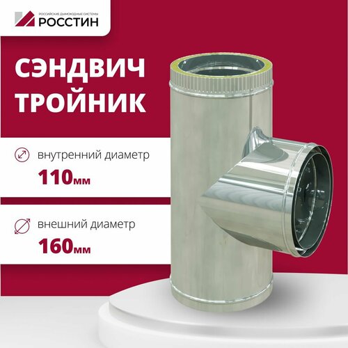 Тройник сэндвич изолированный 90 градусов двухконтурный D110-160 из нержавеющей стали AISI (304-0,5/430-0,5) росстин. Создаёт ответвление дымохода под углом 90 градусов, обеспечивает возможность ревизии для чистки или отвода конденсата.