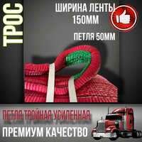 Трос предназначен для буксировки грузовых автомобилей. Собственное производство. Сделан трос из качественной ленты, ширина ленты 150мм. Исполнение : 2слоя двойная петля/ вшивка Трос 50тонн премиум класс Выдерживает разрывную нагрузку 50тонн.