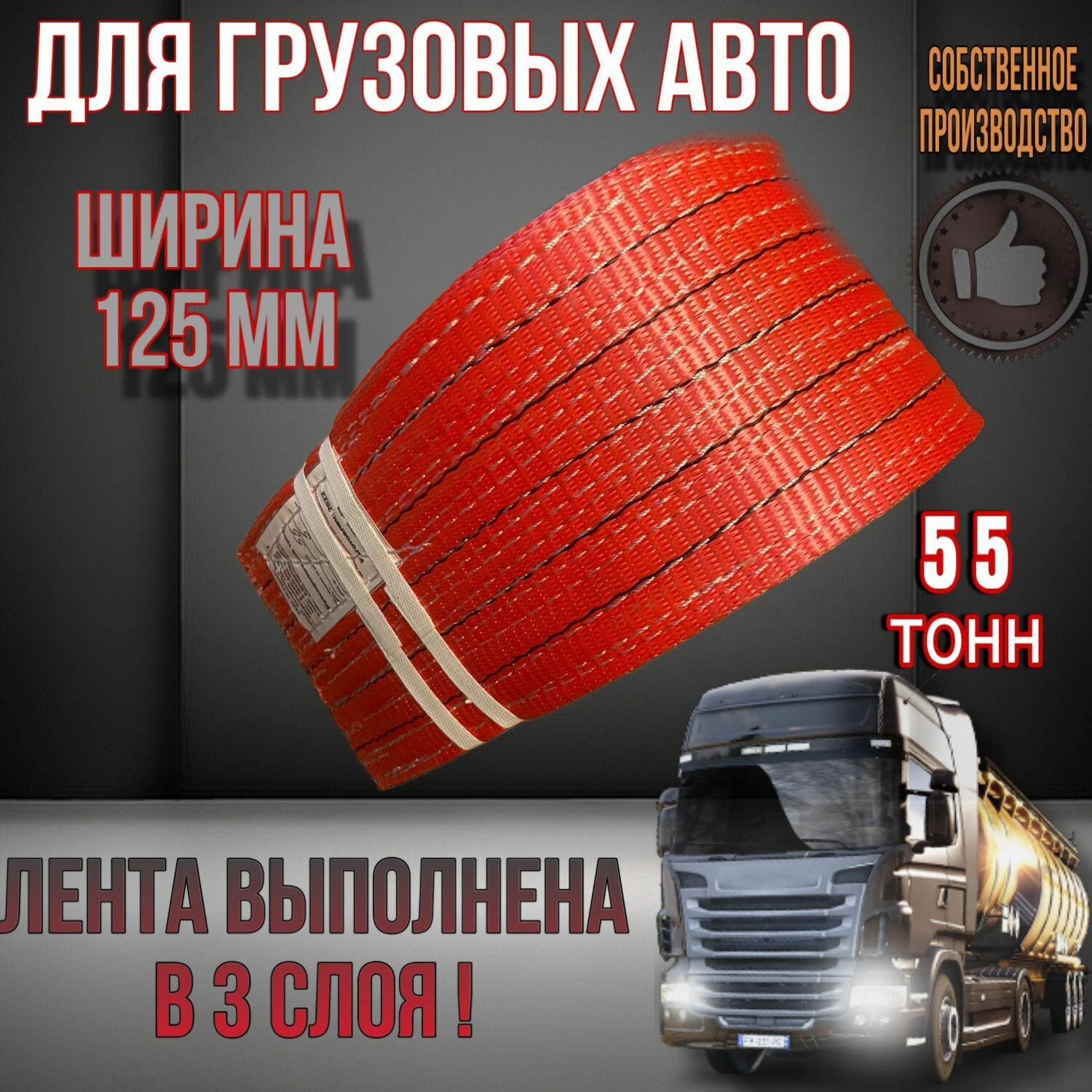 Трос предназначен для буксировки грузовых автомобилей. Собственное производство. Сделан трос из качественной ленты, ширина ленты 125мм. Исполнение : 3слоя двойная петля/ вшивка Трос 55тонн премиум класс Выдерживает разрывную нагрузку 55тонн.