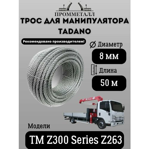 Трос для манипулятора TADANO TM Z300 Series Z263 - высококачественный трос, предназначенный для различных манипуляций с грузами при помощи КМУ. Трос изготовлен из стального каната (конструкции 19х7), диаметр каната 8 мм, длина троса 50 м. Трос поставляется на деревянной катушке, что делает его удобным для хранения и транспортировки.