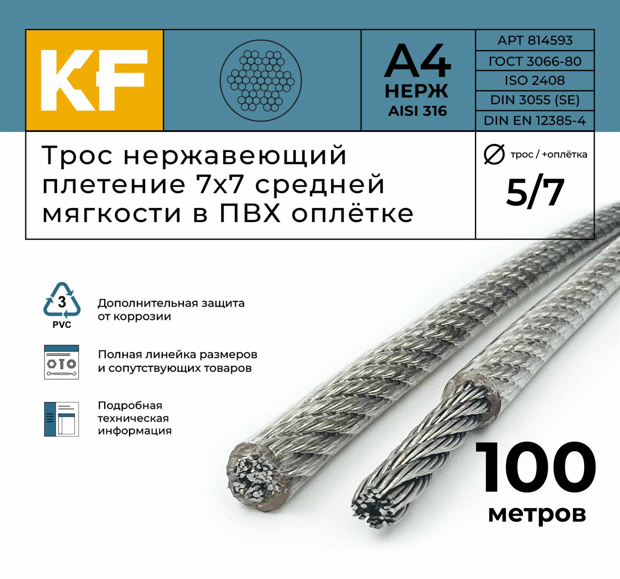 Трос нержавеющий 5,0/7,0 мм сталь А4 плетение 7х7 средней мягкости в ПВХ оплетке 100 метров: сравнение цен, характеристики, фото, актуальное наличие и цены.