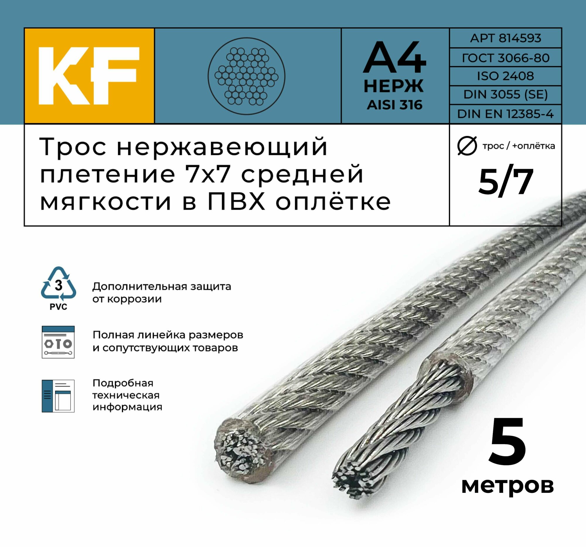 Трос нержавеющий 5,0/7,0 мм сталь А4 плетение 7х7 средней мягкости в ПВХ оплетке 5 метров: сравнение цен, характеристики, фото, актуальное наличие и цены.