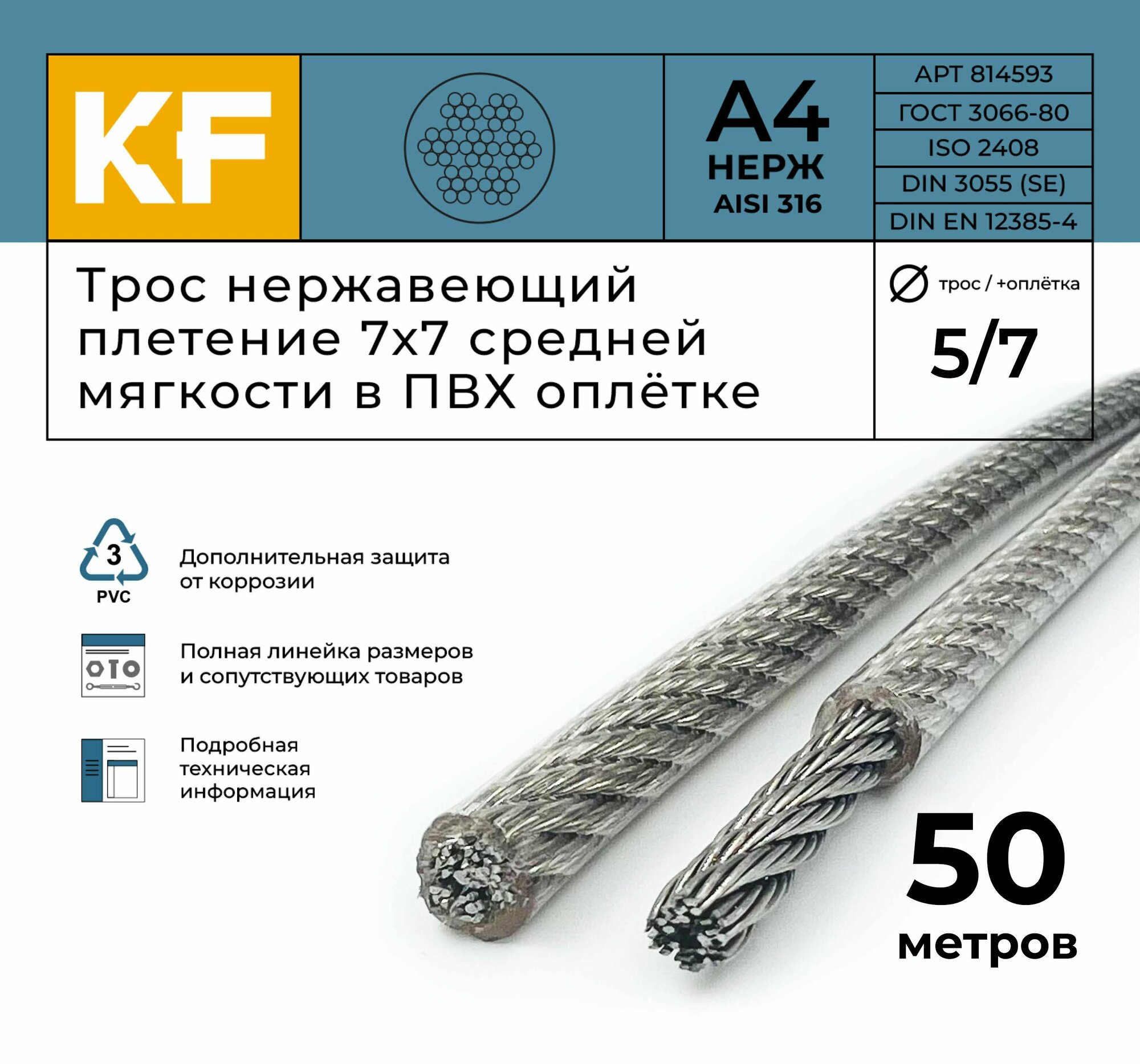 Трос нержавеющий 5,0/7,0 мм сталь А4 плетение 7х7 средней мягкости в ПВХ оплетке 50 метров: сравнение цен, характеристики, фото, актуальное наличие и цены.