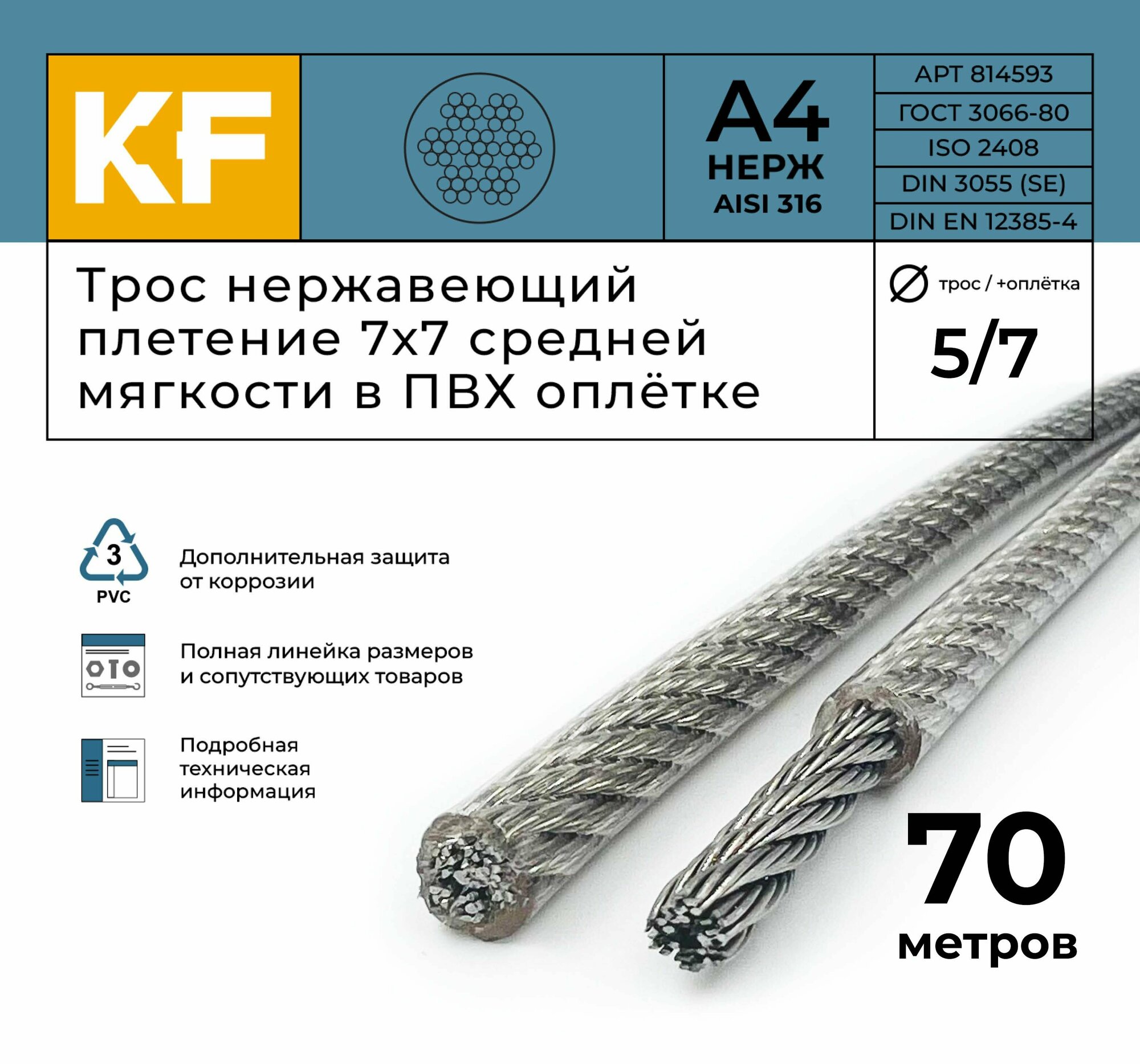 Трос нержавеющий 5,0/7,0 мм сталь А4 плетение 7х7 средней мягкости в ПВХ оплетке 70 метров: сравнение цен, характеристики, фото, актуальное наличие и цены.