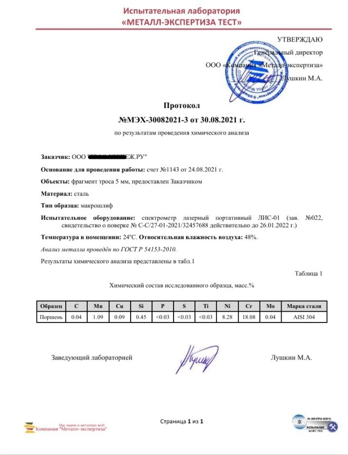 Образцы из каждой партии нержавеющих тросов сдаются на независимую лабораторную экспертизу, где их проверяют с помощью эмиссионного спектрометра на состав металла (самый надежный способ).