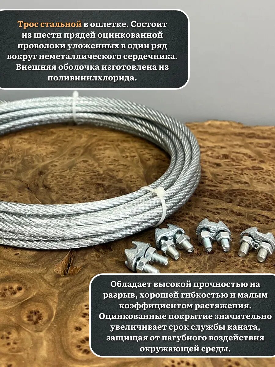 Трос стальной 5/6 с зажимами (4 шт.) ОЦ в оплетке, 20 м.: сравнение цен, характеристики, фото, актуальное наличие и цены.